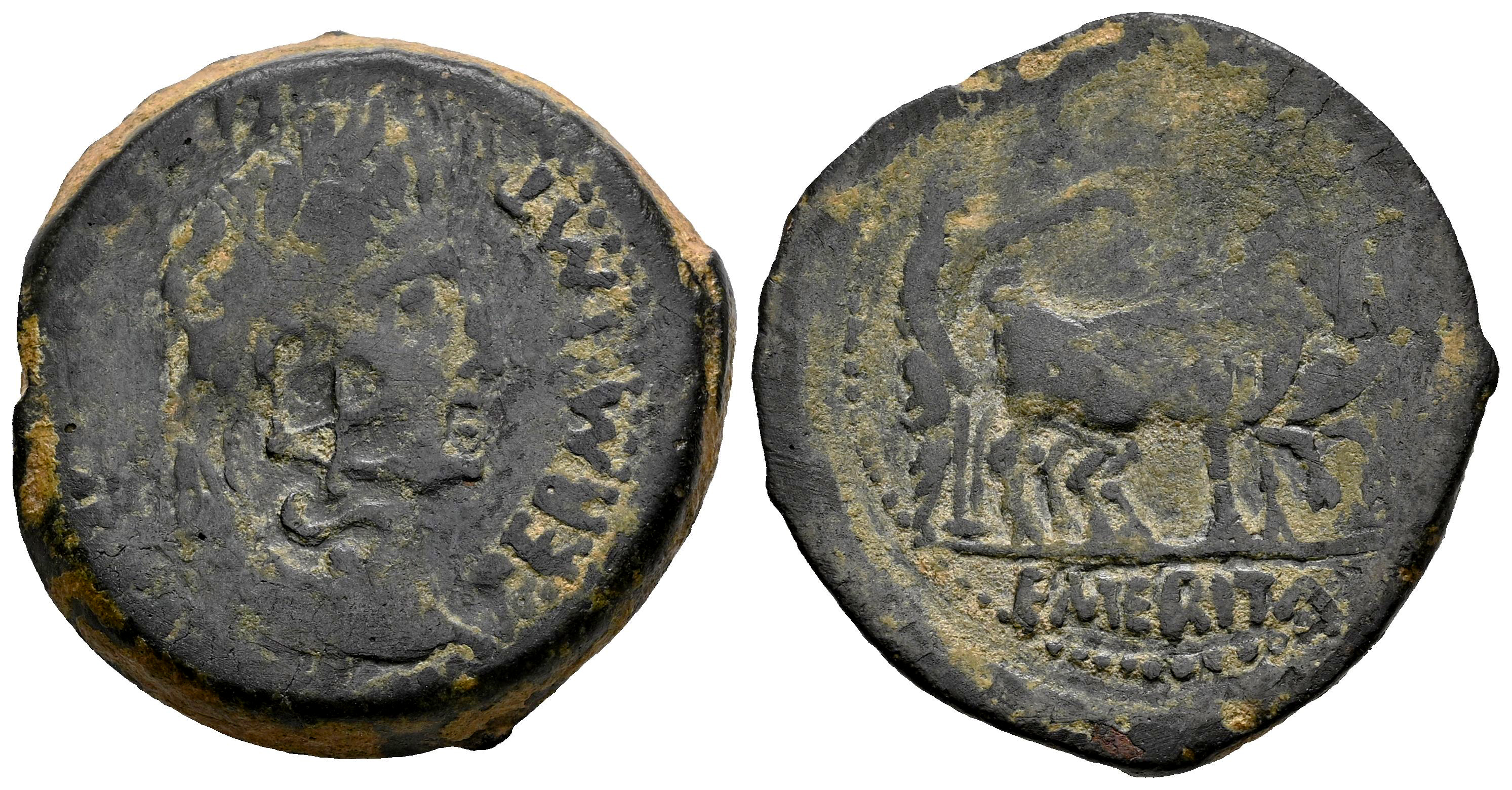 Emerita Augusta. Época de Augusto. As. 22 a.C.-14 d.C. Mérida (Badajoz). (Abh-1012). (MIB-250/98). (Tesorillo-5-32 Emerita, mismo ejemplar). Anv.: Cabeza laureada de augusto a derecha, alrededor PERM. IMP. CAESARIS. AVG. P.P. Rev.: Yunta a derecha, encima AVGVSTA, debajo EMERITA. Ae. 10,25 g. Contramarca "S·AE" anexadas en anverso. Rara. Ex J. A. Herrero (11/12/2014), lote 61. MBC-/MBC. Est...120,00.