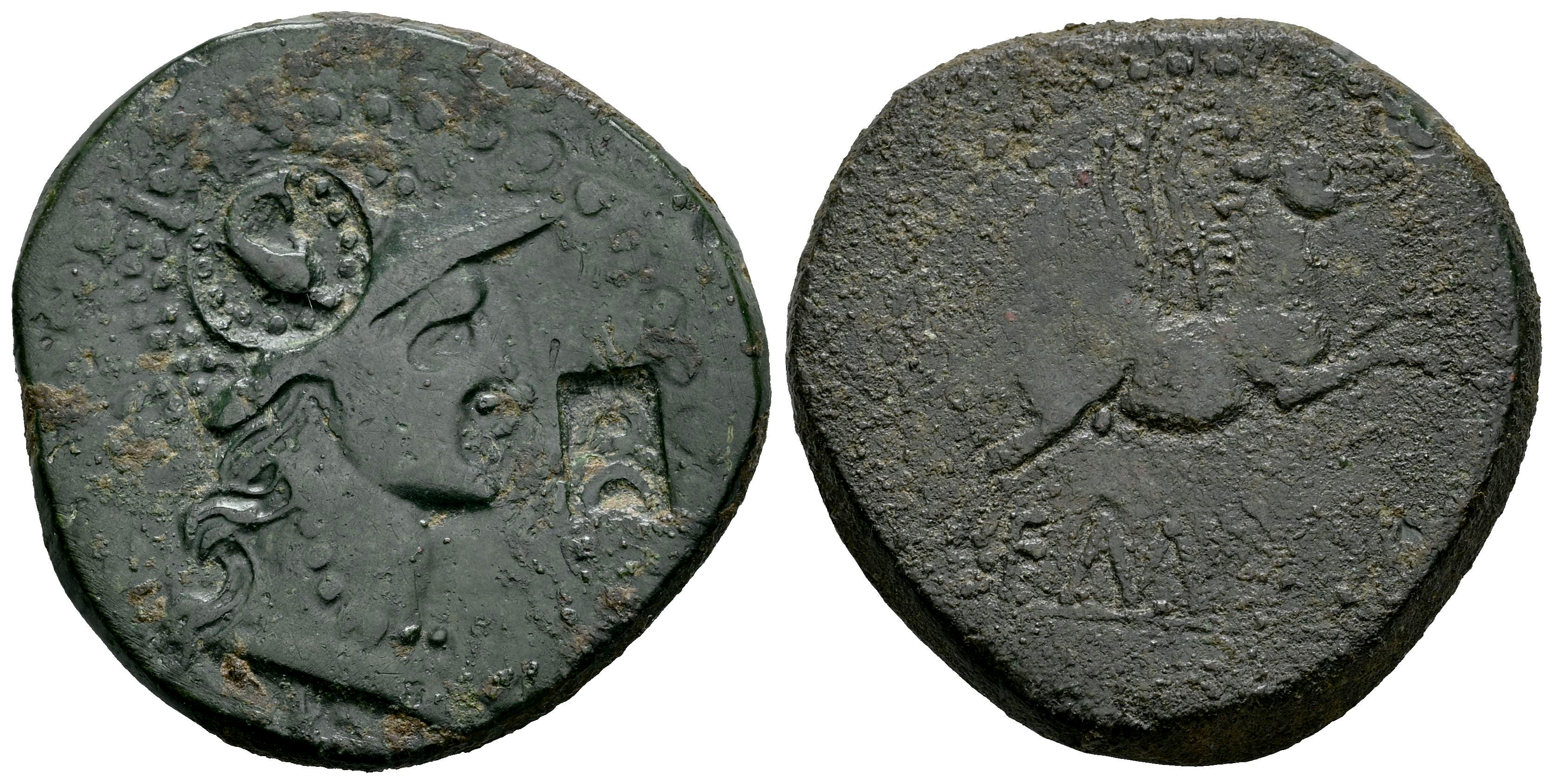 Emporiton. As. 50-27 a.C. L’Escala, Ampurias (Girona). (Abh-1247). (Tesorillo-1-03/1 y 4-30/1, mismo ejemplar). Anv.: Cabeza de Palas a derecha. Rev.: Pegaso a derecha, encima láurea, debajo EMPOR. Ae. 14,37 g. Contramarcas de "Delfín o marsopa" dentro de cartela circular con gráfila de puntos y "D.D" dentro de cartela rectangular, ambos en anverso. MBC/BC+. Est...120,00.
