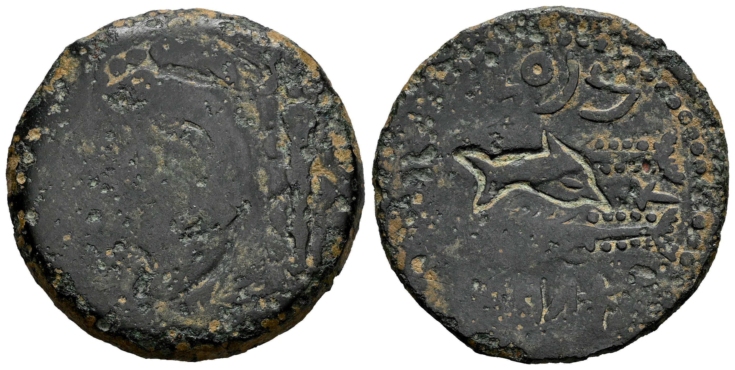 Gades-Gadir. As. 100-20 a.C. Cádiz. (Abh-1339). (MIB-247/6a). (Tesorillo-1-04a/1, mismo ejemplar). Anv.: Cabeza de Hércules a izquierda, detrás clava. Rev.: Dos atunes a izquierda arriba y abajo, leyenda púnica, entre ambos creciente con punto y letra púnica alef. Ae. 7,85 g. Contramarca "Delfín" a la derecha sobre el reverso. Muy bien definida. BC/MBC-. Est...70,00.