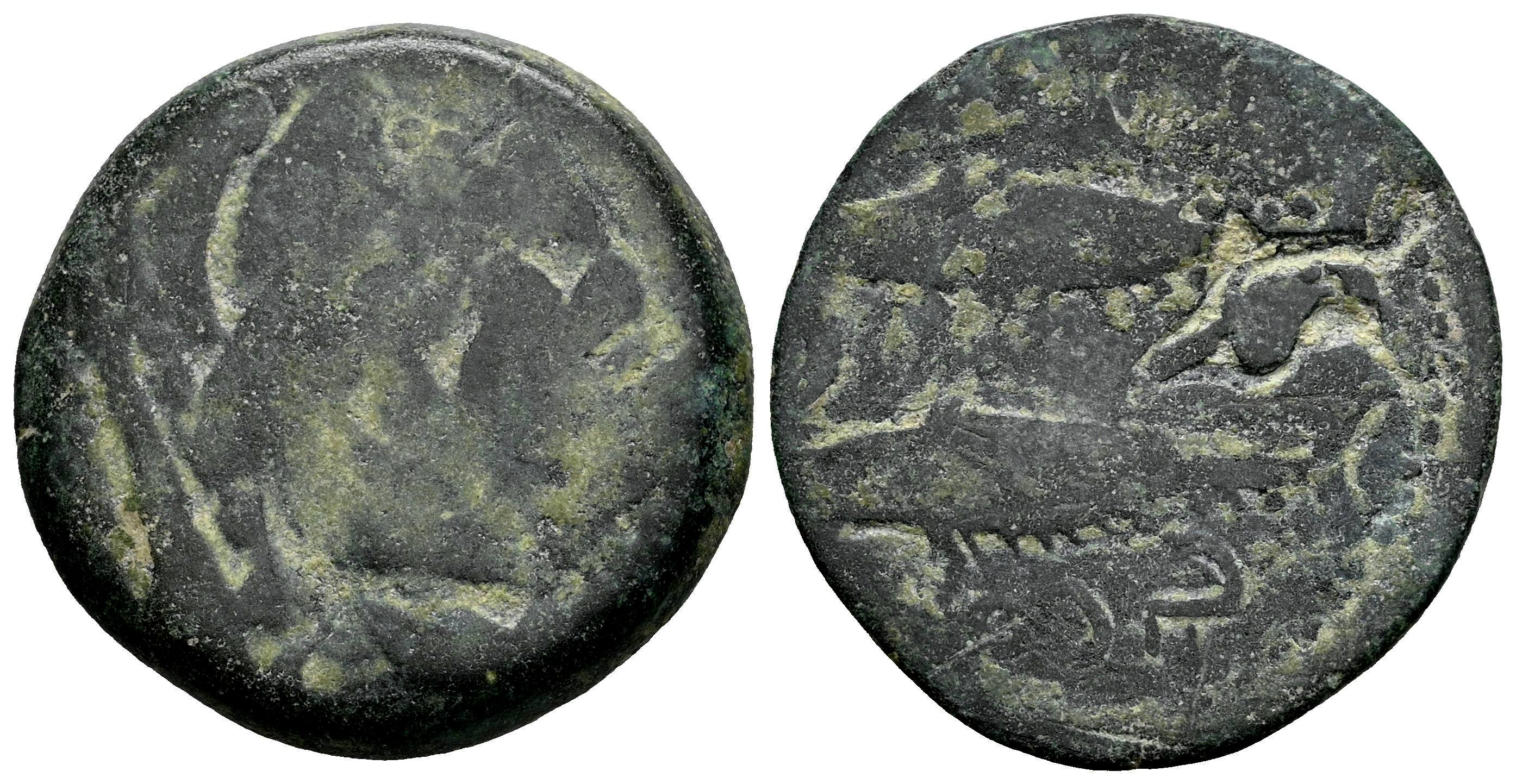 Gades-Gadir. As. 100-20 a.C. Cádiz. (Abh-1339). (MIB-148/6b). (Tesorillo-1-04b/2, mismo ejemplar). Anv.: Cabeza de Hércules a izquierda, detrás clava. Rev.: Dos atunes a izquierda arriba y abajo, leyenda púnica, entre ambos creciente con punto y letra púnica alef. Ae. 7,17 g. Contramarca de "delfín o marsopa" a la derecha sobre el reverso. BC/BC+. Est...45,00.
