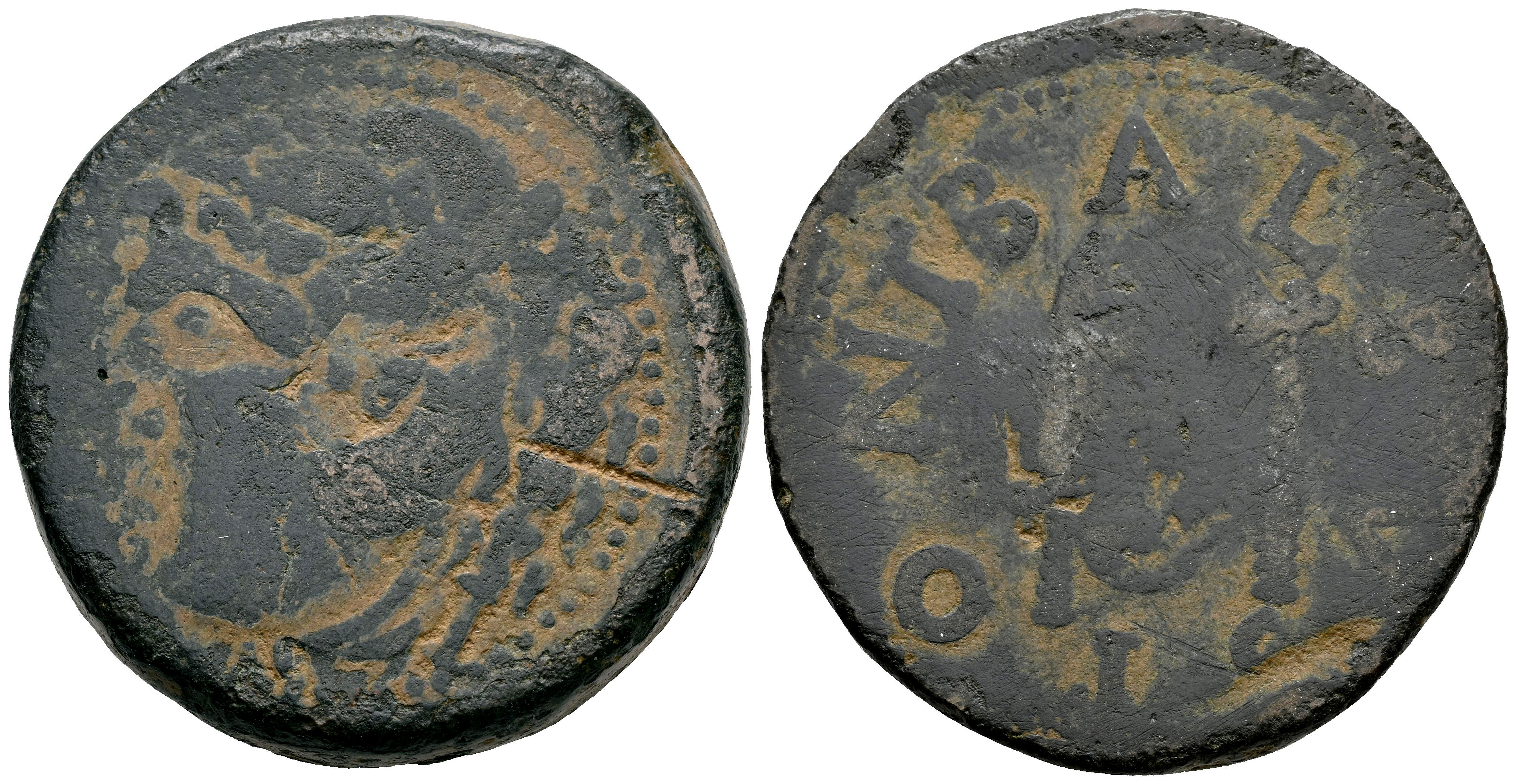 Gades-Gadir. Época de Augusto. Sestercio. 27 a.C-14 d.C. Cádiz. (Abh-1364). (Tesorillo-2-58/3, mismo ejemplar). Anv.: Cabeza de Hércules a izquierda, detrás clava. Rev.: Cuchillo, símpulo y hacha, alrededor leyenda de lectura interna BALBVS. PONT. Ae. 43,95 g. Contramarca de "Barra o golpe de cizalla" en el anverso. Ex Colección Archer M. Huntington, J. Vico 132 (14/11/2012), lote 595. Ex HSA-23834. Conserva la etiqueta original. BC+. Est...150,00.
