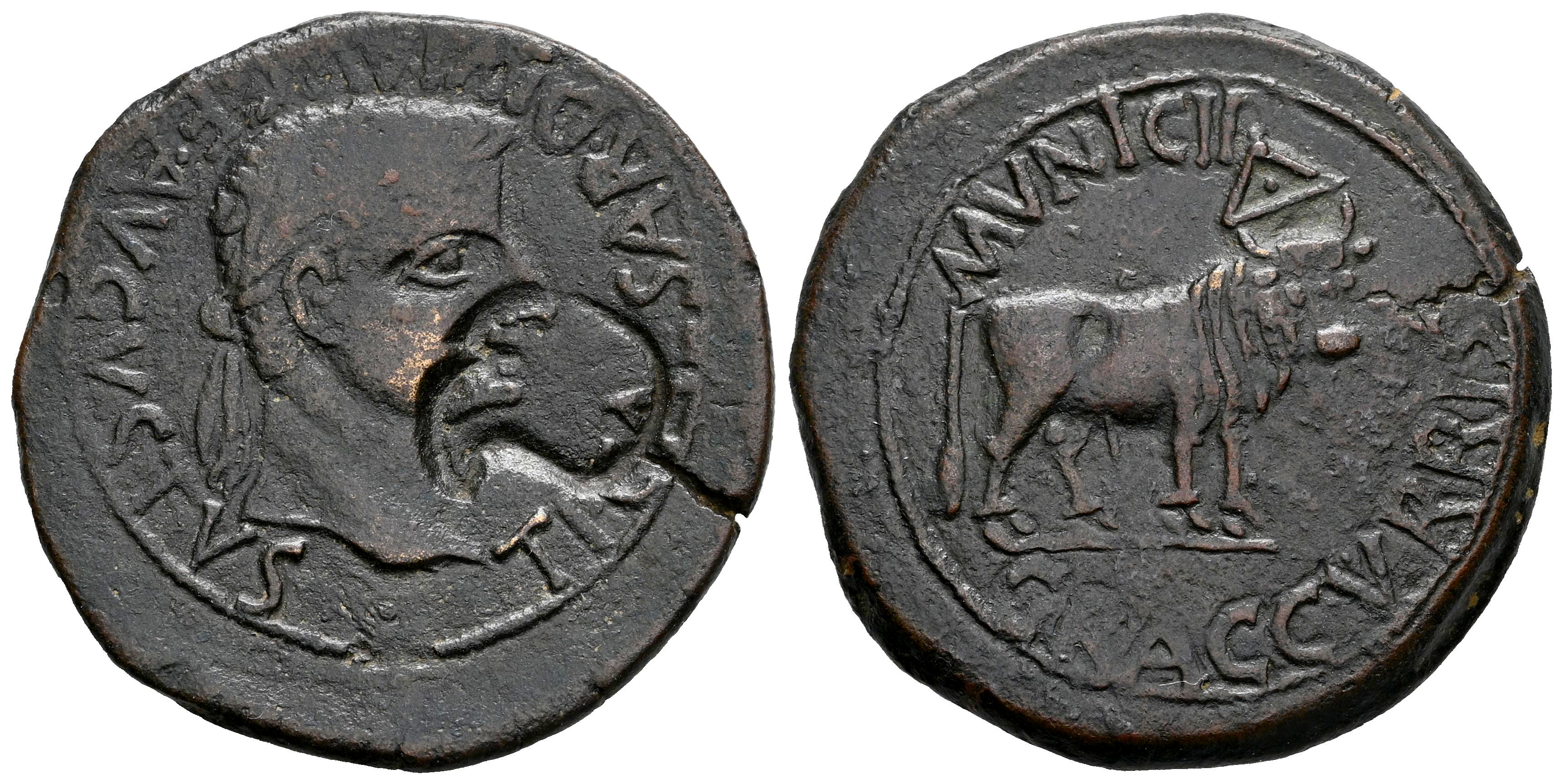 Graccurris. Época de Tiberio. As. 14-36 d.C. Alfaro (La Rioja). (Abh-1391). (Tesorillo-1-13b/5, mismo ejemplar). Anv.: Cabeza laureada de Tiberio a derecha, alrededor TI. CAESAR. DIVI. AVG. F. AVGVSTVS. Rev.: Toro mitrado a derecha, encima MVNICIP, debajo GRACCVRRIS. Ae. 12,73 g. Contramarca "Cabeza de águila legionaria" a la izquierda en el anverso. Ex J. Vico 135 (13/06/2013), lote 50. Conserva la etiqueta original. MBC. Est...120,00.