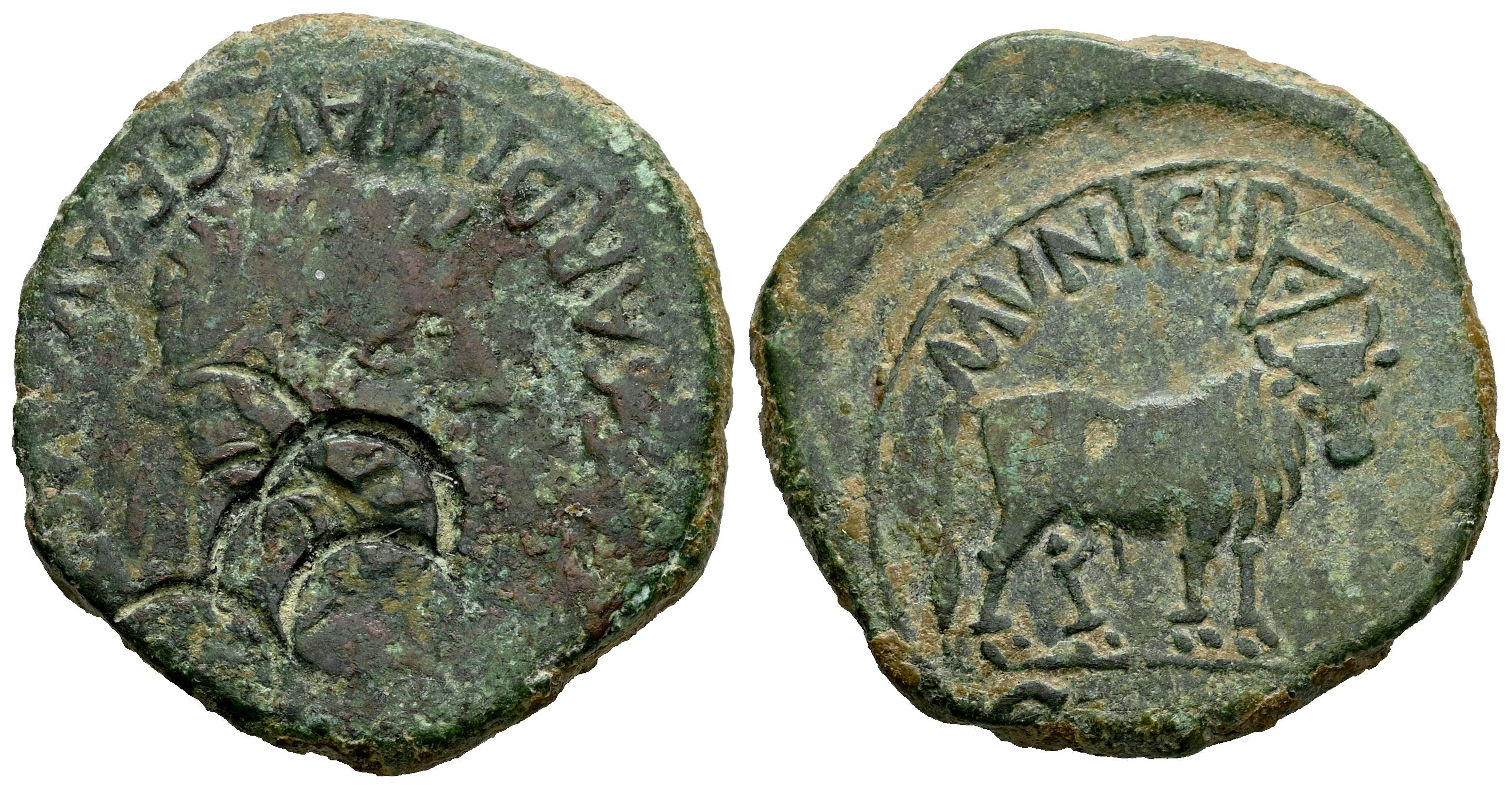 Graccurris. Época de Tiberio. As. 14-36 d.C. Alfaro (La Rioja). (Abh-1391). (Tesorillo-6-02/1, mismo ejemplar). Anv.: Cabeza laureada de Tiberio a derecha, alrededor TI. CAESAR. DIVI. AVG. F. AVGVSTVS. Rev.: Toro mitrado a derecha, encima MVNICIP, debajo GRACCVRRIS. Ae. 11,12 g. Múltiples contramarca "Cabeza de águila legionaria" a la derecha en el anverso. BC+/MBC. Est...70,00.