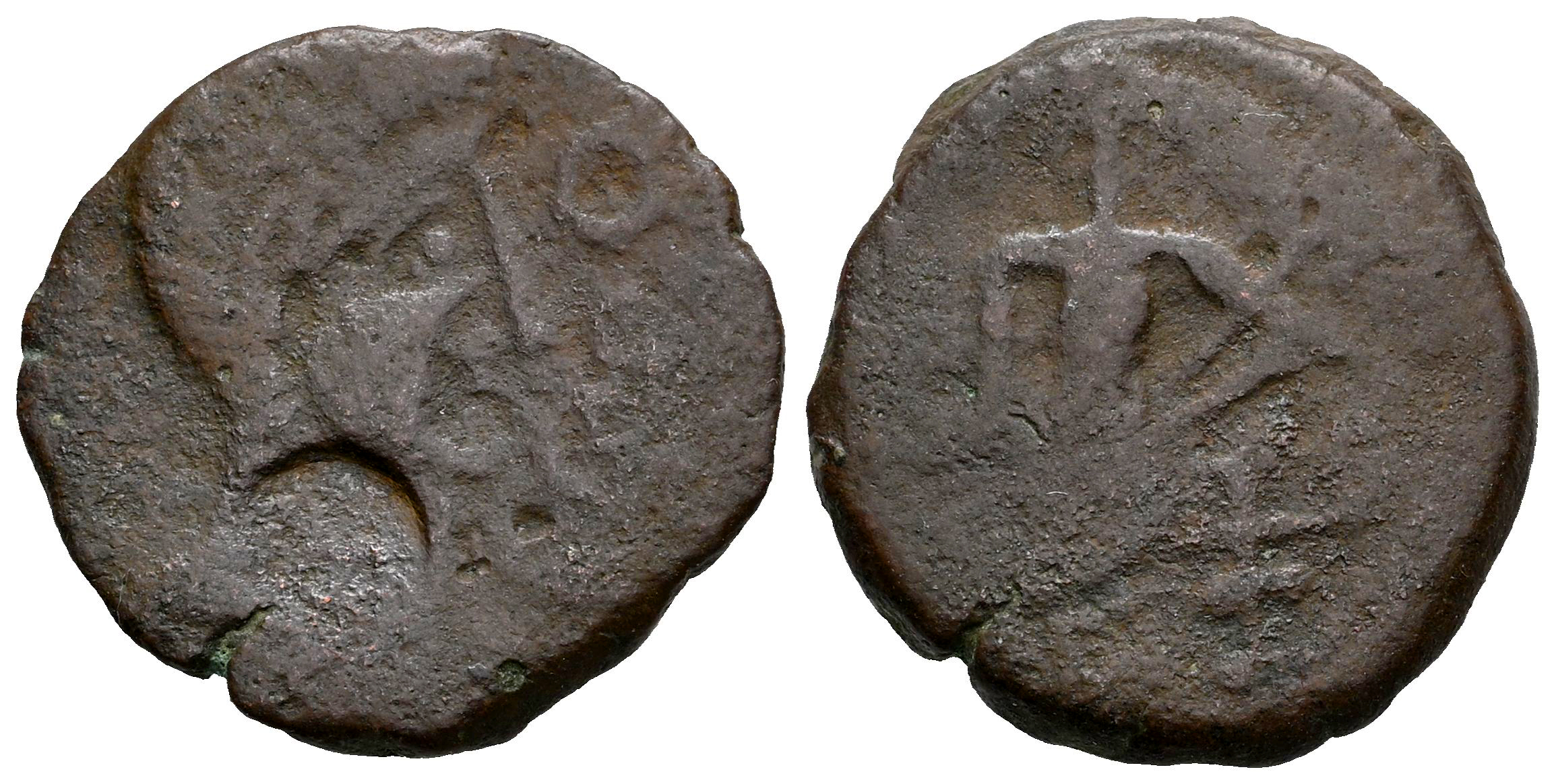 Irippo. As. 30 a.C. Zona sur de Sevilla. (Abh-1581). (Tesorillo-2-25, mismo ejemplar). Anv.: Cabeza de ¿Octavio? a derecha, delante IRIPPO. Rev.: Deidad femenina sentada a izquierda con piña y cornucopia. Ae. 4,76 g. Contramarca de "punzón circular" en el anverso. BC+. Est...50,00.