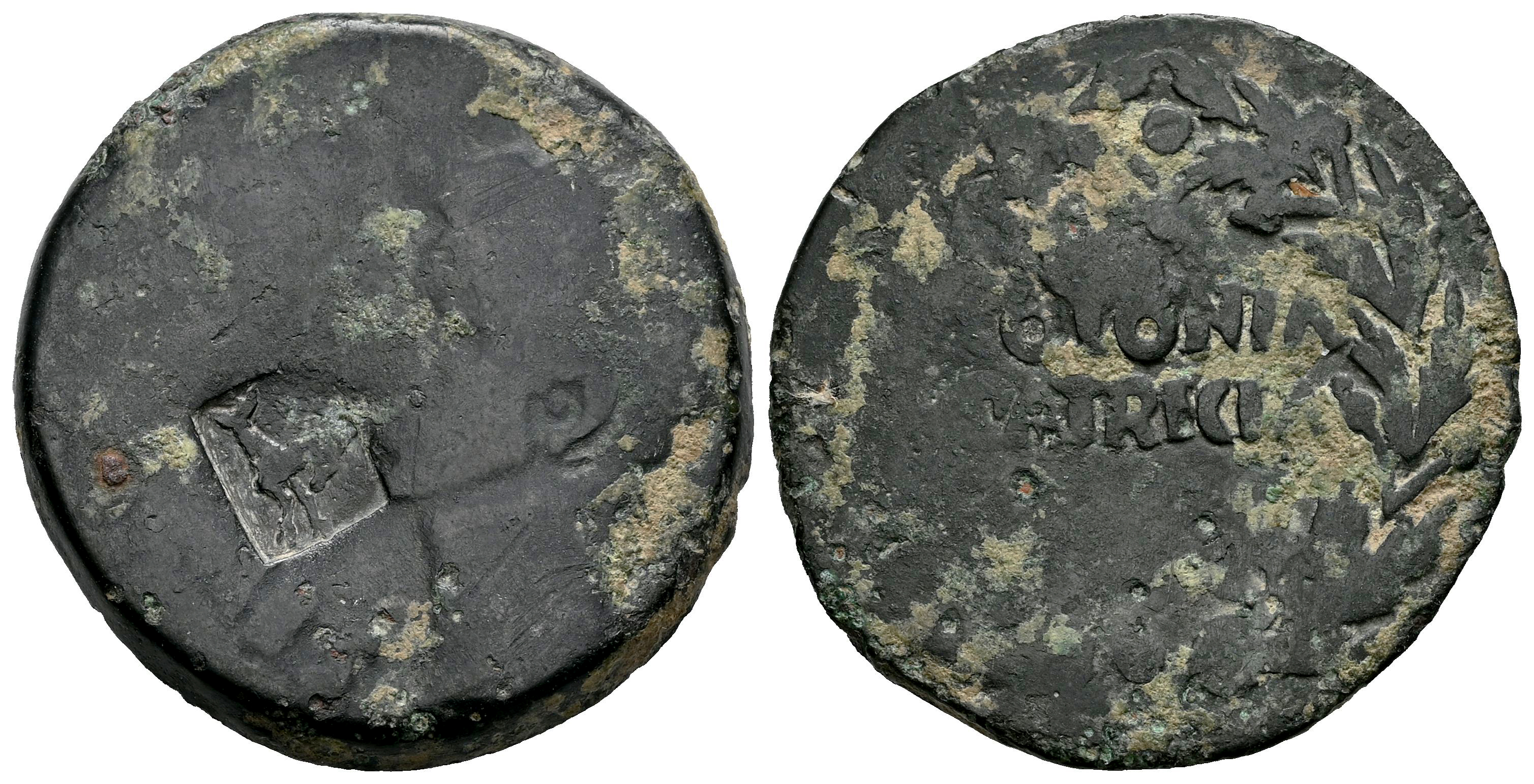 Colonia Patricia. Época de Augusto. As. 27 a.C-14 d.C. Córdoba. (Abh-1989). (CCH-2.16). (Tesorillo-1-2, mismo ejemplar). Anv.: Cabeza de Augusto a izquierda, alrededor PERM. CAES. AVG. Rev.: Láurea, en el centro COLONIA. PATRICIA. Ae. 9,39 g. Contramarca de capricornio dentro de cartela rectangular en anverso. Muy rara. BC-/BC+. Est...60,00.