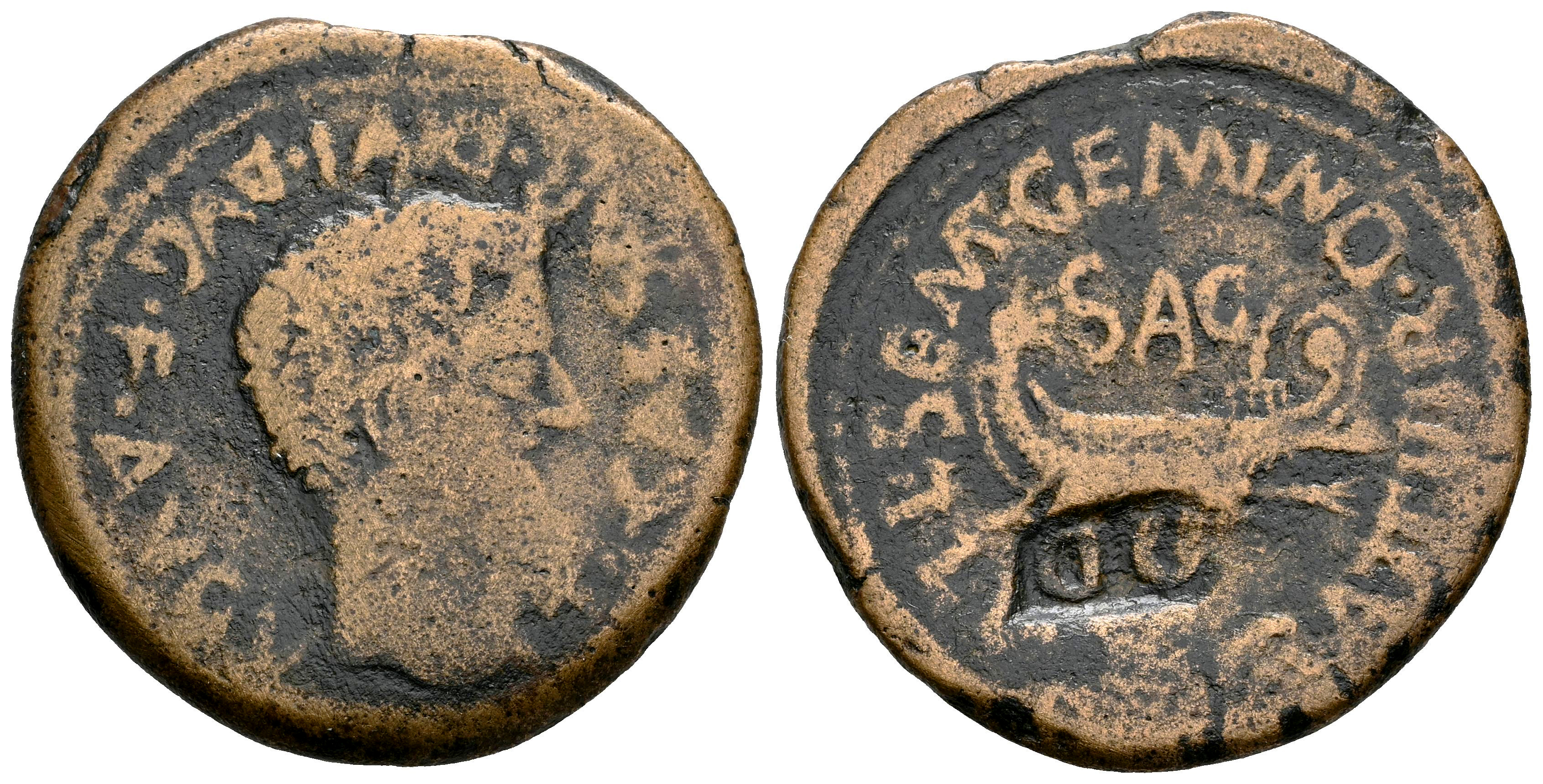Arse-Saguntum. Época de Tiberio. As. 14-36 d.C. Sagunto (Valencia). (Abh-2091). (MIB-126/65b). (Tesorillo-4-30/11, mismo ejemplar). Anv.: Cabeza de Tiberio a derecha, alrededor TI. CAESAR. DIVI. AVG. F. AVG. Rev.: Nave, encima SAG, alrededor L. SEMP. GEMINO. L. VAL. SVRA. II. VIR. Ae. 10,62 g. Contramarca "DD" dentro de cartela rectangular en el reverso. Ex J. Vico 120 (04/06/2009), lote 3084. Conserva la etiqueta original. BC/MBC-. Est...80,00.