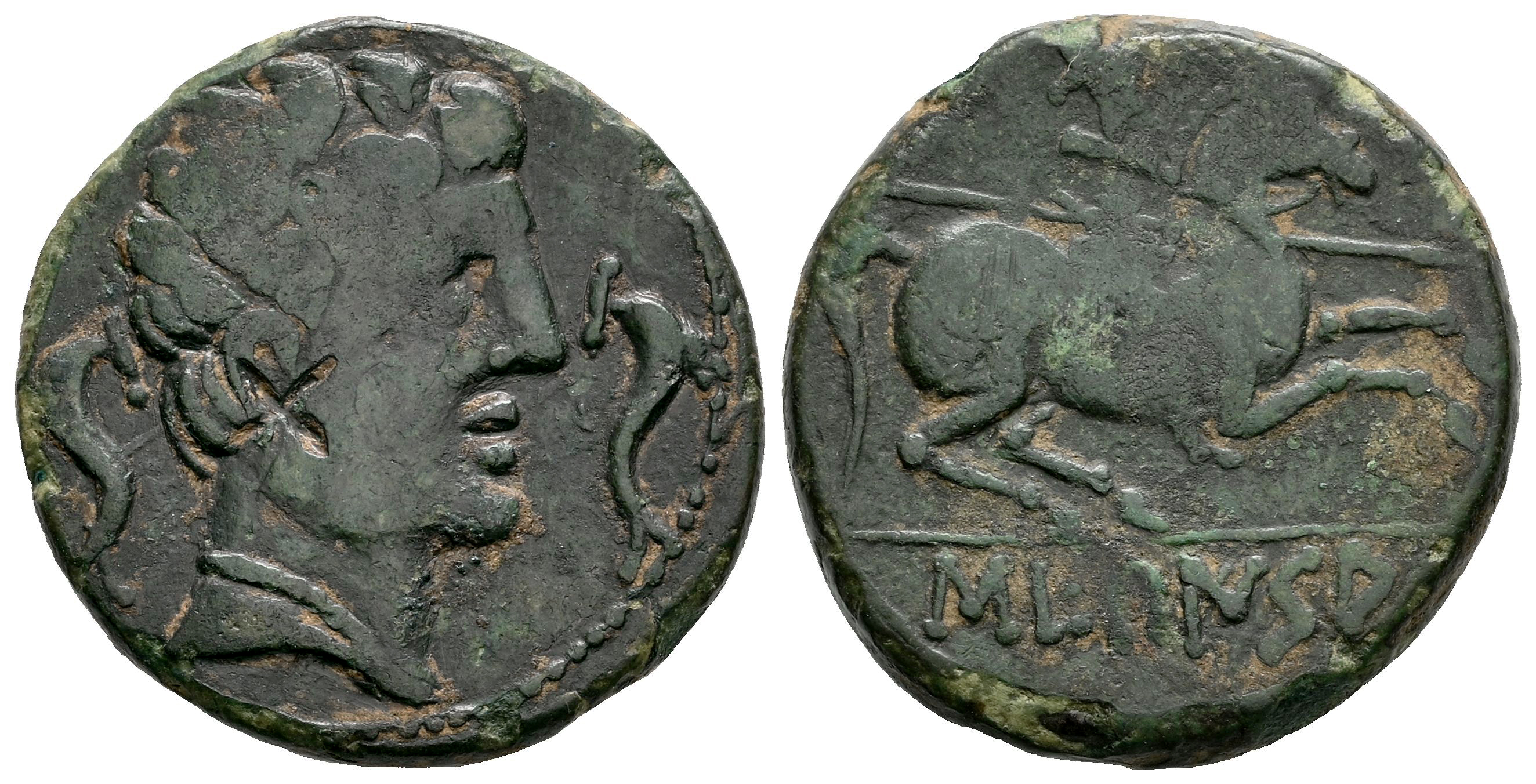 Sekaisa. As. 120-20 a.C. Zona de Aragón. (Abh-2131). (MIB-413/60). (Tesorillo-3-55/3, mismo ejemplar). Anv.: Cabeza masculina a derecha, entre dos delfines. Rev.: Jinete con lanza a derecha, debajo de línea leyenda ibérica SEKAISA. Ae. 7,76 g. Contramarca "X" incisa en el anverso. Bonita pátina verde. Rara. MBC/MBC-. Est...80,00.