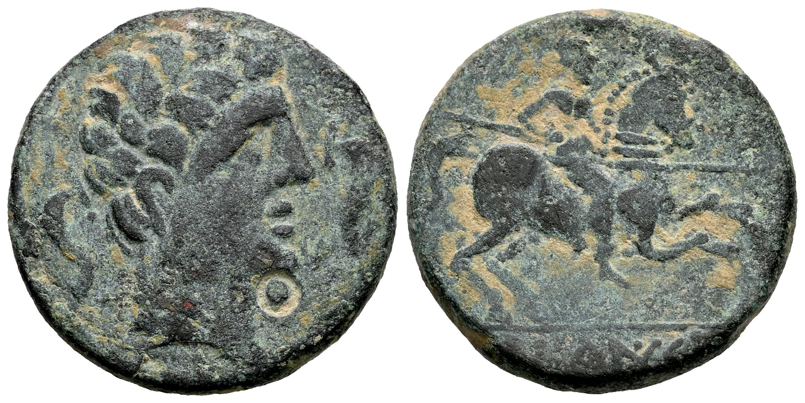 Sekaisa. As. 120-20 a.C. Zona de Aragón. (Abh-2131). (MIB-80/49b ID 98337, mismo ejemplar). (Tesorillo-2-24/2, mismo ejemplar). Anv.: Cabeza masculina a derecha, entre dos delfines. Rev.: Jinete con lanza a derecha, debajo de línea leyenda ibérica SEKAISA. Ae. 7,88 g. Contramarca "Punzón circular" siempre debajo de la barbilla y en el anverso. Ex Colección G. Cores 2254, J. Vico 152 (15/11/2018), lote 175. Conserva la etiqueta original. BC+. Est...90,00.
