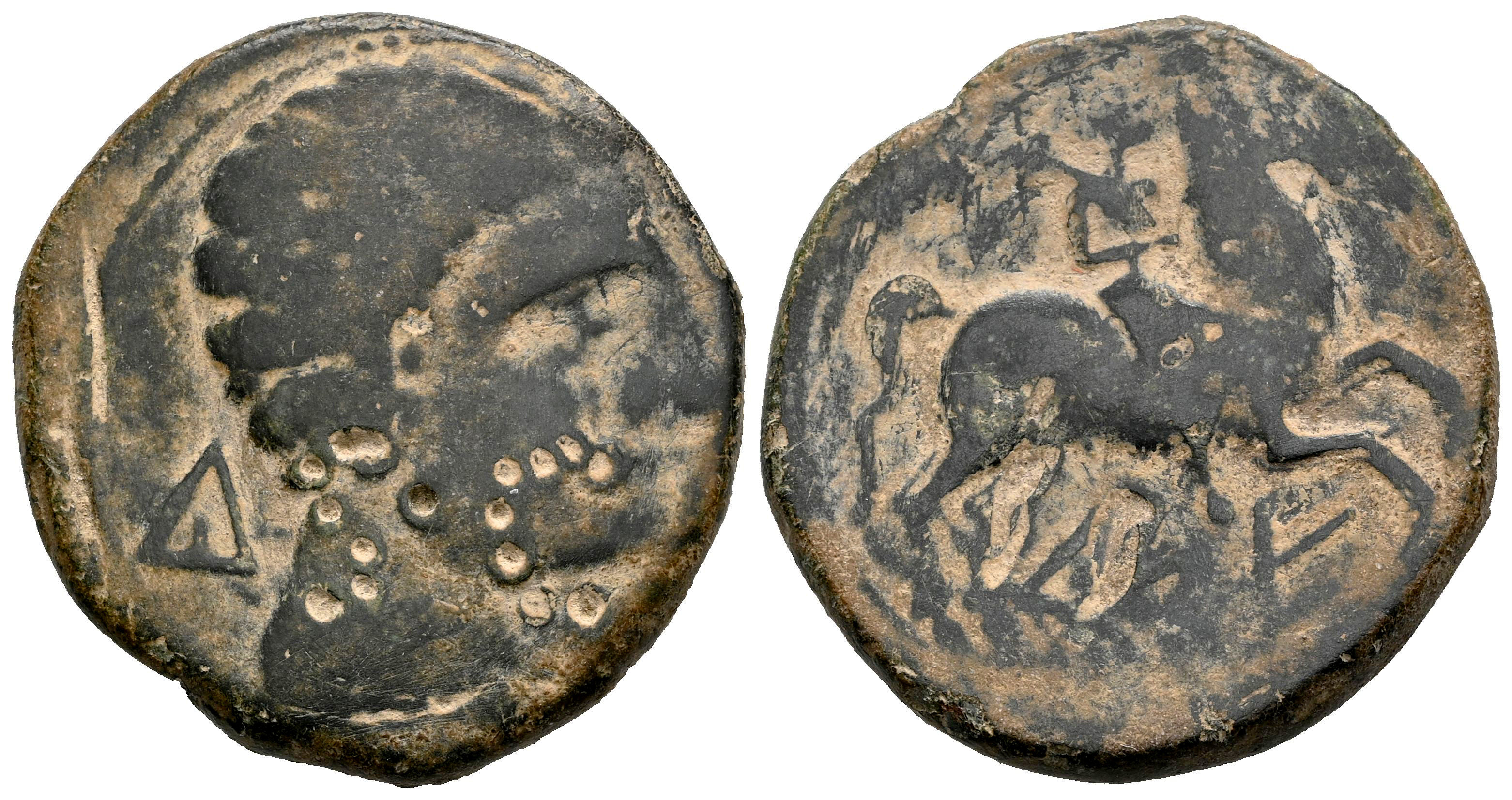 Kese. As. 220-200 a.C. Tarragona. (Abh-2291). (MIB-427/80a ID 156083, mismo ejemplar). (Tesorillo-4-71 y 4-81, mismo ejemplar). Anv.: Cabeza masculina a derecha, detrás letra ibérica DU. Rev.: Jinete a derecha, con palma, debajo leyenda ibércia KESE. Ae. 11,82 g. Contramarcas "SC" realizada con punzón en anverso y "SS" en el reverso. Rara. MBC. Est...90,00.