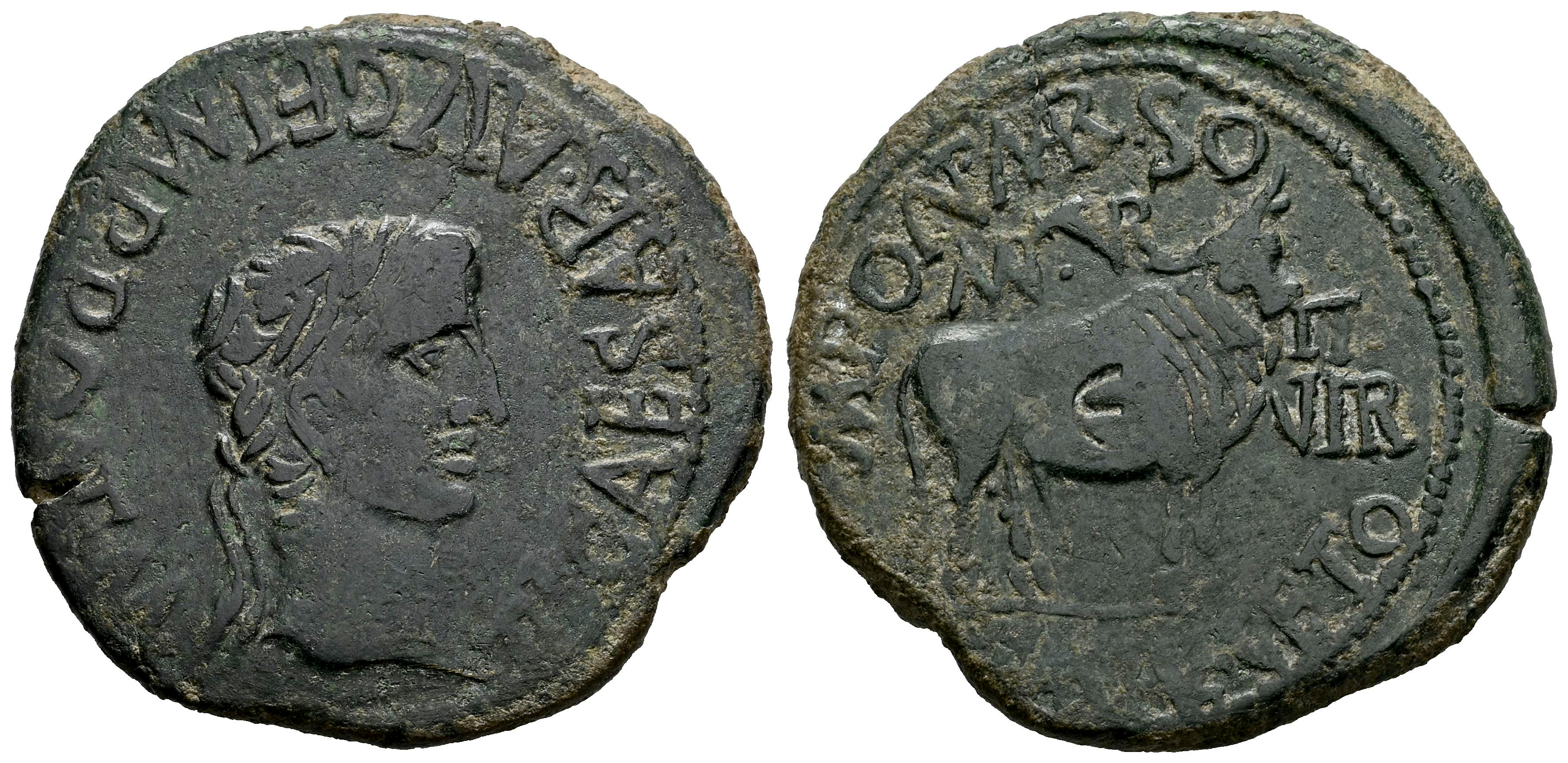 Turiaso. Época de Augusto. As. 27 a.C-14 d.C. Tarazona (Zaragoza). (Abh-2450). (Tesorillo-3-02/2, mismo ejemplar). Anv.: Cabeza laureada de Tiberio a derecha, alrededor TI. CAESAR. AVG F. IMP. PONT. M. Rev.: Toro a derecha, alrededor M PONT MARSO, encima del toro MVN. TVR, II VIR a la derecha, C MARI VEGETO debajo. Ae. 13,14 g. Contramarca "Є" incisa en el reverso. Bonita pátina. Rara. MBC+. Est...120,00.