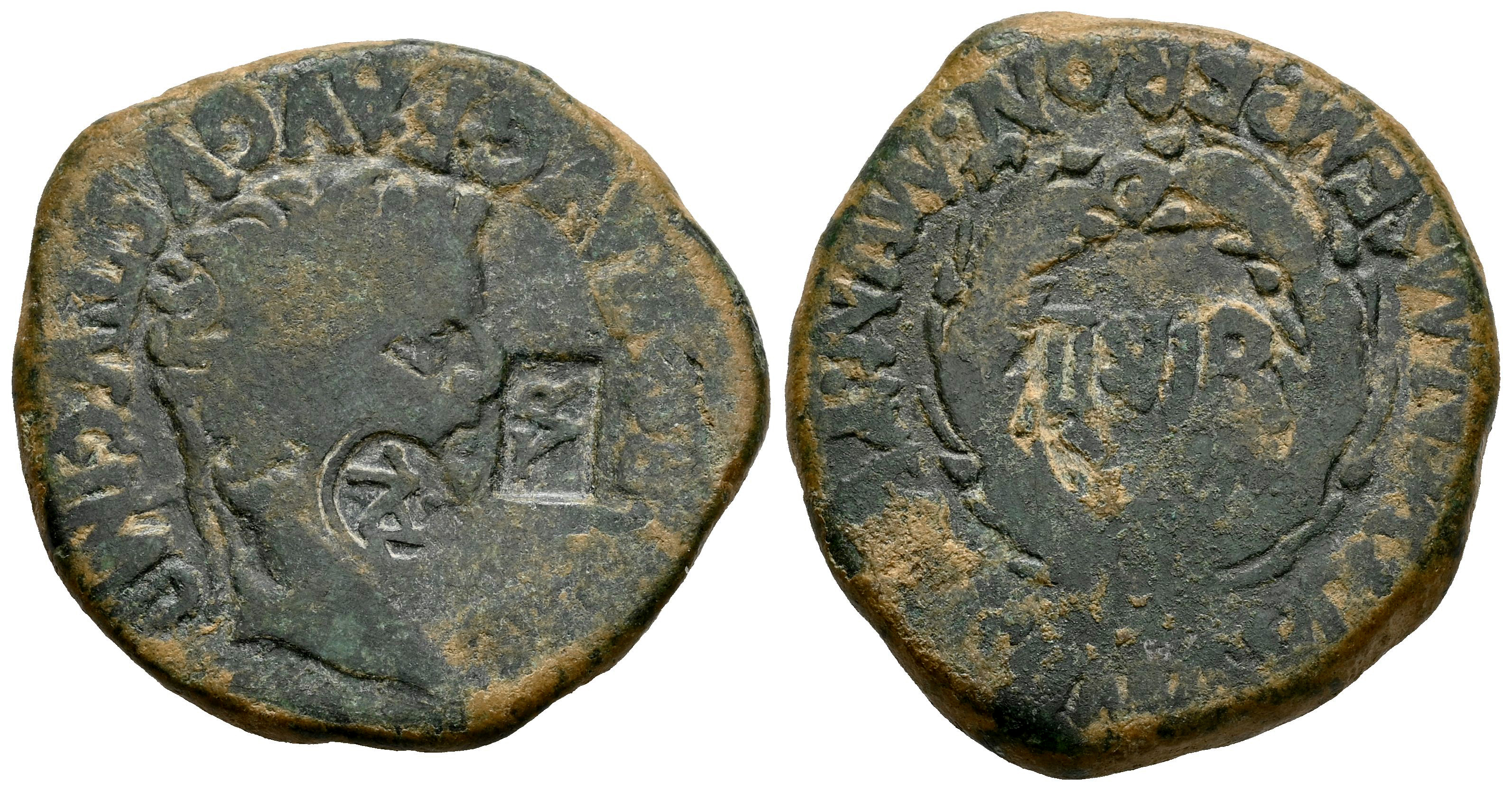 Turiaso. Época de Augusto. As. 27 a.C-14 d.C. Tarazona (Zaragoza). (Abh-2455). (Tesorillo-5-02/6 y 5-36/15, mismo ejemplar). Anv.: Cabeza laureada de Tiberio a derecha, alrededor TI. CAESAR. AVG. F. AVGVSTVS. IMP. P.P. Rev.: Láurea, dentro II. VIR., alrededor MAN. SVLP. LVCAN. M. SEMP. FRONT. MVN. TVRIASO. Ae. 13,55 g. Contramarcas "AL" anexadas dentro de círculo y monograma "TVR" interpretada como abreviatura de la propia ceca, dentro de cartela rectangular, ambas en anverso. Rara. MBC-. Est...80,00.