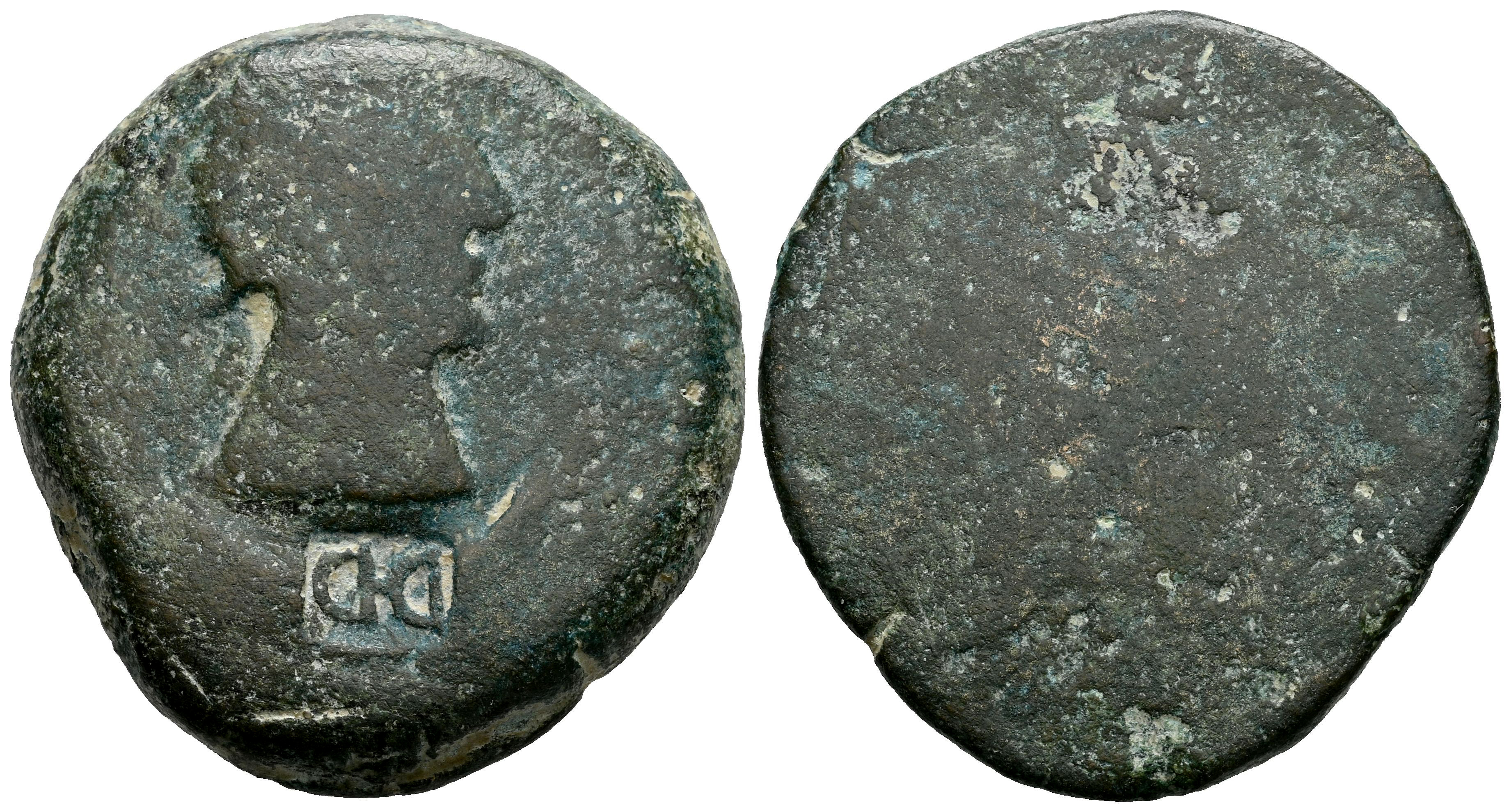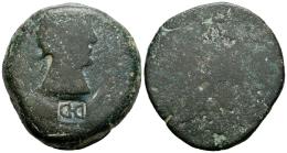 Ulia. As. 50 a.C. Montemayor (Córdoba). (Abh-2490?). (MIB-415/65a). (Tesorillo-4-30, mismo ejemplar). Anv.: Cabeza femenina a derecha, delante espiga, debajo ¿creciente?. Rev.: Ramas de vid alrededor de cartela con VLIA. Ae. 23,91 g. Contramarca "D·D" dentro de cartela rectangular en el anverso. Muy rara sobre esta emisión. BC-. Est...60,00.