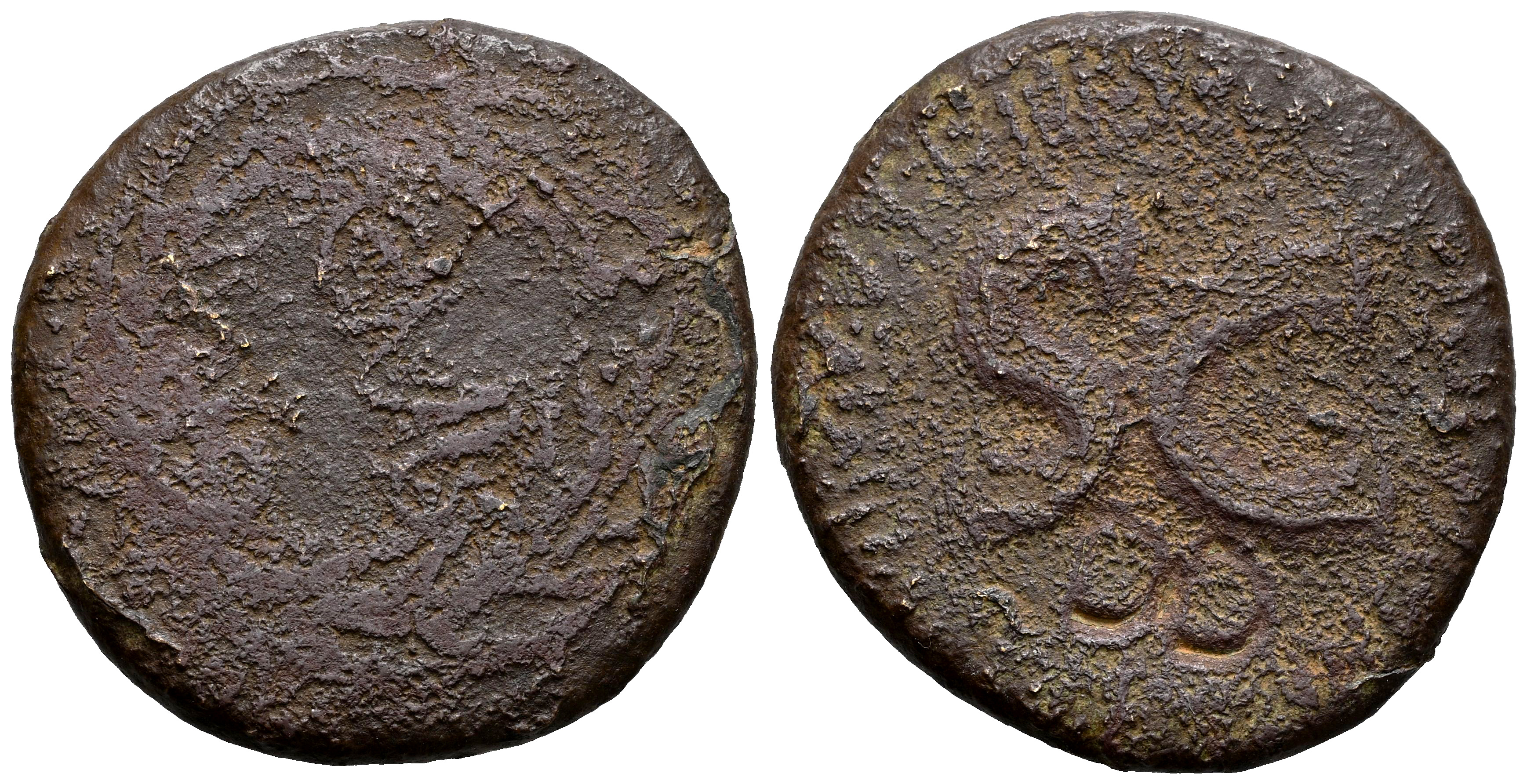 Augusto. Sestercio. 17 a.C. Roma. (Ric-I 345?). (Bmcre-195?). (Tesorillo-Augusto 4, mismo ejemplar). Anv.: P. Licinius Stolo, ensayador. OB CIVIS SERVATOS, corona de roble entre dos ramas de laurel. Rev.: P• LICINIVS• STOLO• III• VIR• A• A• A• F• F• alrededor de gran S • C. Ae. 15,56 g. Contramarca "D D" incisa en el reverso. Muy rara sobre esta emisión. BC. Est...80,00.
