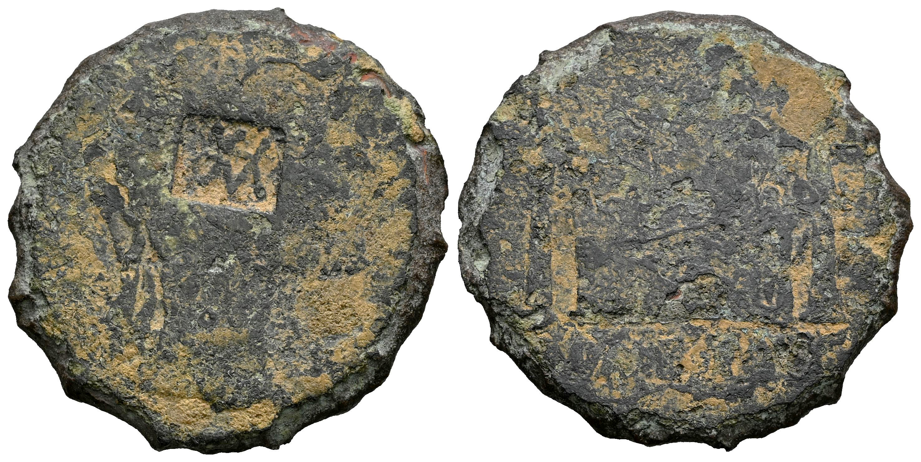 Augusto. As. 9-14 d.C. Lugdunum. (Ric-I 233). (Bmcre-567). (Tesorillo-Augusto 54, mismo ejemplar). Anv.: (CAESAR AVGVSTVS DIVI F PATER PATRIAE), Cabeza laureada a la derecha. Rev.: ROM ET AVG, Parte frontal del Altar de Lugdunum, decorado con la corona cívica entre laureles, flanqueada por figuras masculinas estilizadas; a izquierda y derecha, Victorias sobre columnas, enfrentadas. Ae. 7,75 g. Contramarca "VAR" anexadas dentro de cartela rectangular en anverso. Esta marca se relaciona con VARus, Publio Quintilio Varo legado en Germania, aunque otros autores dudan de esta atribución. Muy rara. BC-. Est...50,00.