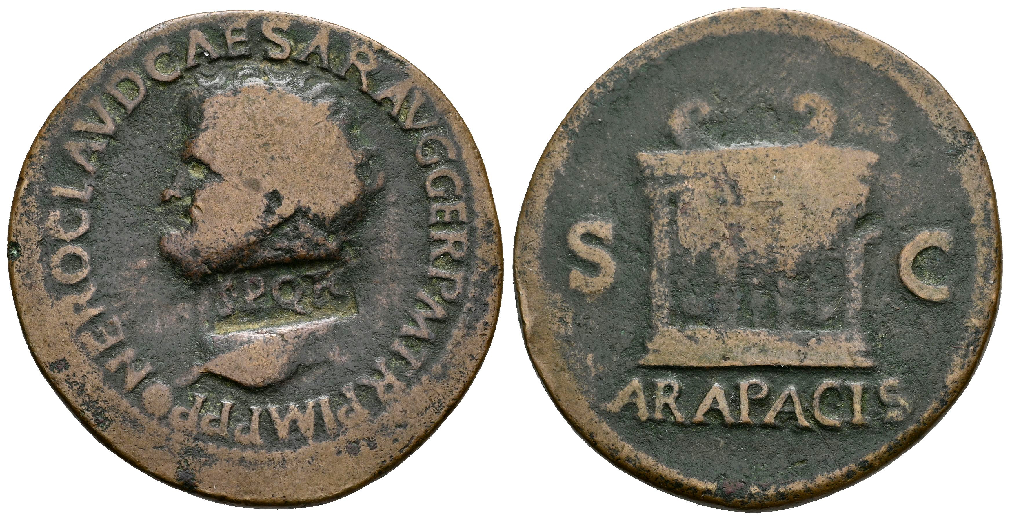 Nerón. As. 65 d.C. Lugdunum. (Ric-I 461). (Tesorillo-Nerón 5, mismo ejemplar). Anv.: NERO CLAVD CAESAR AVG GER P M TR P IMP P P,. Cabeza denuda a la izquierda, globo al final del cuello. Rev.: ARA PACIS en exergo,recinto del altar con parte superior ornamentada, paneles frontales decorados y puertas centrales dobles. Ae. 9,59 g. Contramarca "SPQR" dentro de cartela rectangular en anverso. En significado de dicha marca es evidente "Senatus PopulusQue Romanus" y se asocia a la presencia de las tropas de Vindex en la Galia. Ex Gert Boersema, Vcoins (Octubre 2015). MBC-. Est...200,00.
