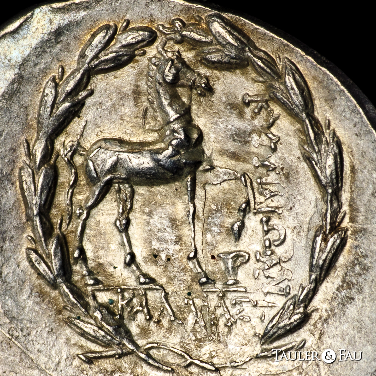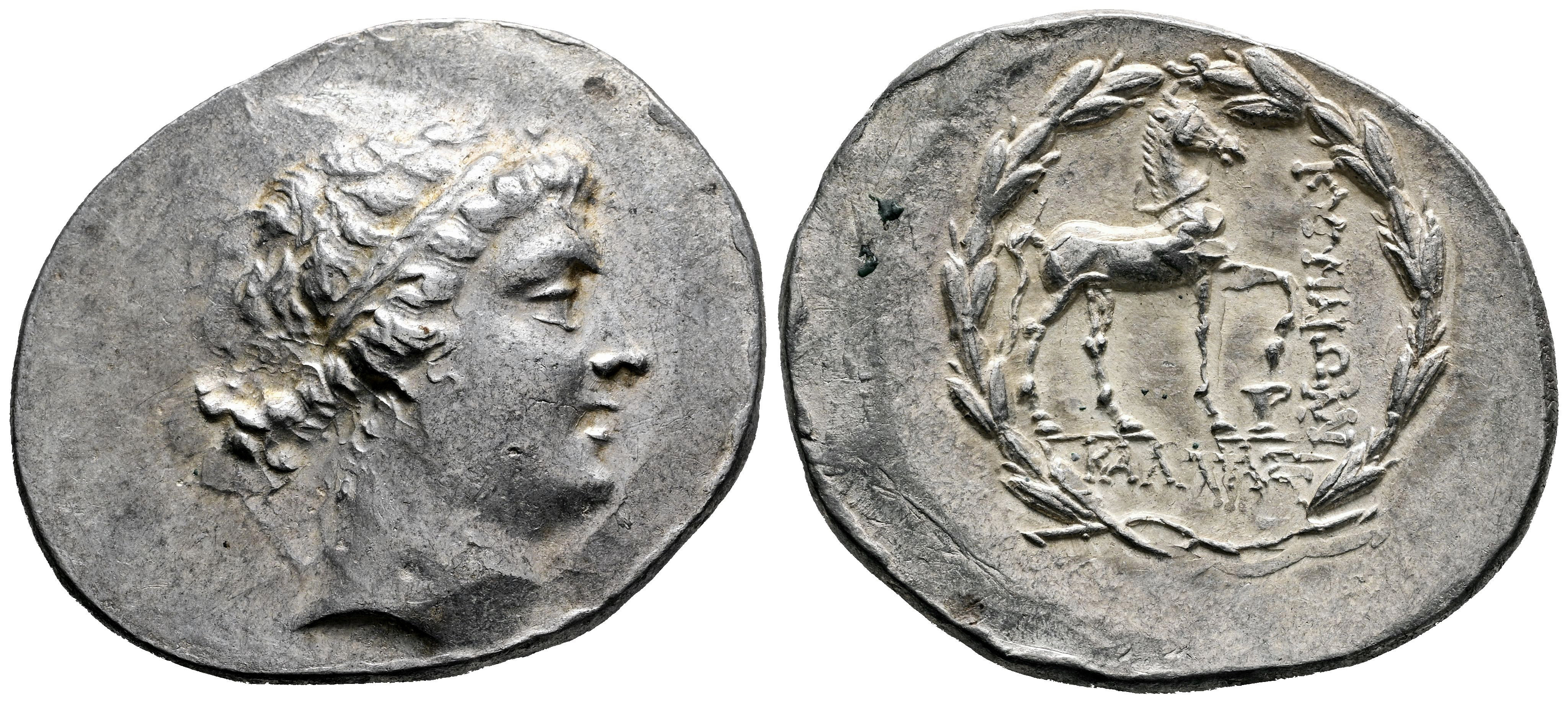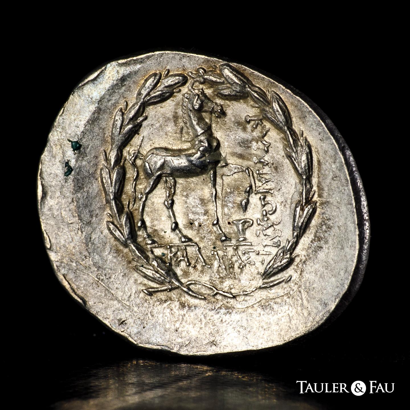 Aeolis. Kyme. Tetradracma. 155-140 a.C. Magistrado Kallias. (Sng von Aulock-166). (Sng Cop-103). (Sng Delepierre-2556). Anv.: Cabeza de la amazona Kyme a la derecha, con tainia. Rev.: Caballo brincando a la derecha; copa con un asa debajo de la pata delantera levantada, KYMAIΩN hacia abajo a la derecha, KAΛΛIAΣ debajo; todo dentro de una corona. Ag. 16,81 g. Suave tono. Ligera doble acuñación en reverso. Atractiva. EBC-. Est...1500,00.