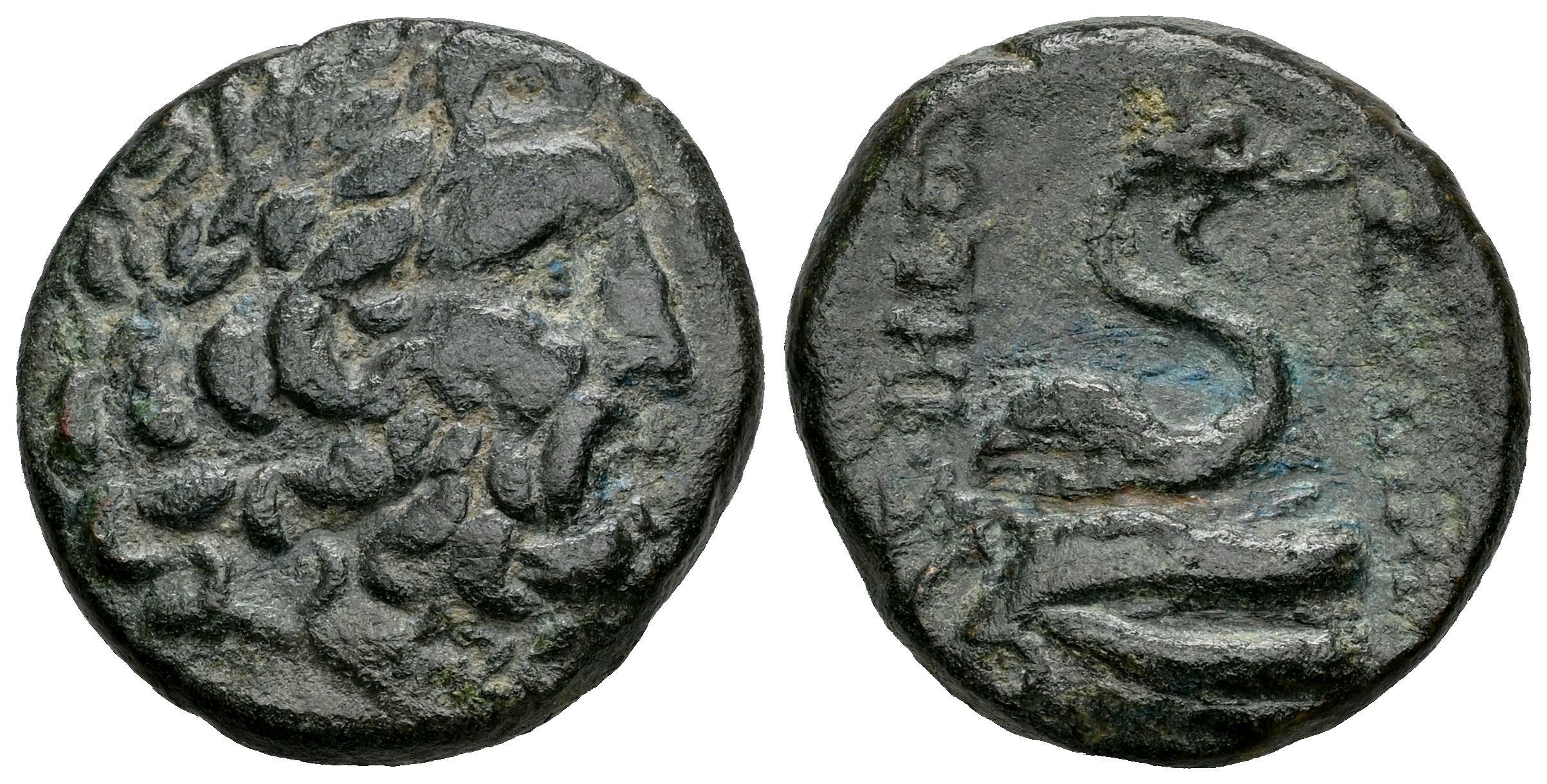 Mysia. Pergamon. AE 21. 133-27 a.C. (SNG BnF-1815). Anv.: Cabeza laureada de Asklepios a la derecha. Rev.: ΑΣΚΛΗΠΙΟΥ ΣΩΤΗΡΟΣ, serpiente enrollada alrededor de omphalos. Ae. 8,18 g. MBC. Est...50,00.