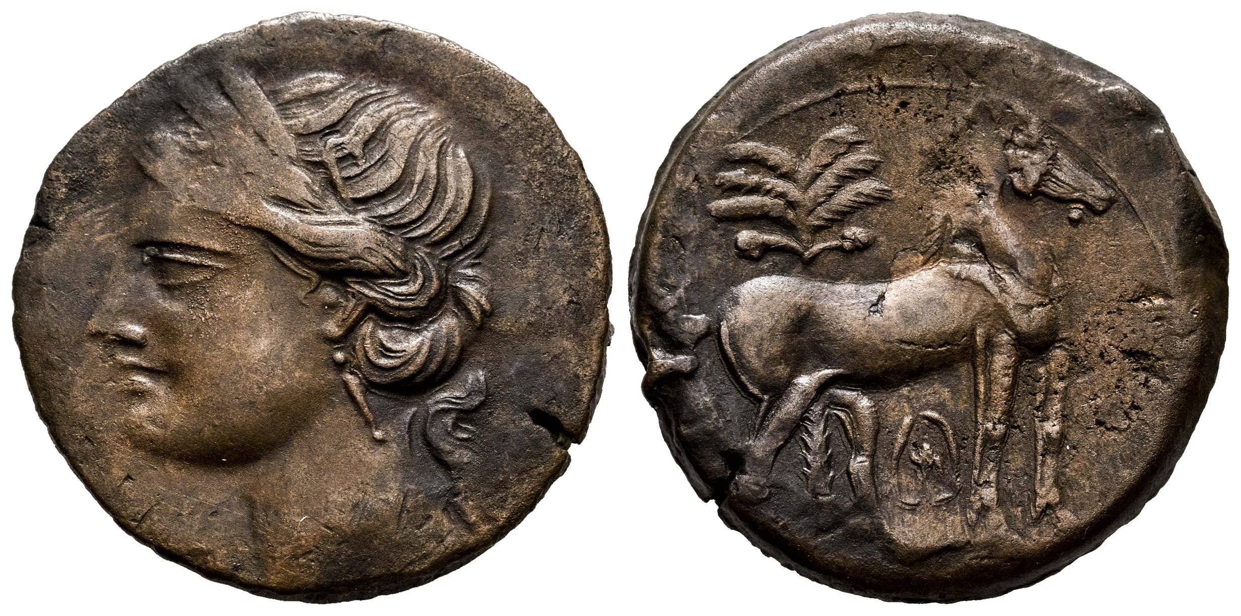 Norte de África. Cartago. Trishekel. 210-202 a.C. Segunda guerra Púnica. (CNP-164b). (MAA-84b). (Sng Cop-341/3). Anv.: Cabeza de Tanit con corona a la izquierda. Rev.: Caballo en pie a la derecha; palmera detrás; monograma púnico (sin dentro de tet) debajo. Ae. 17,34 g. MBC+. Est...160,00.