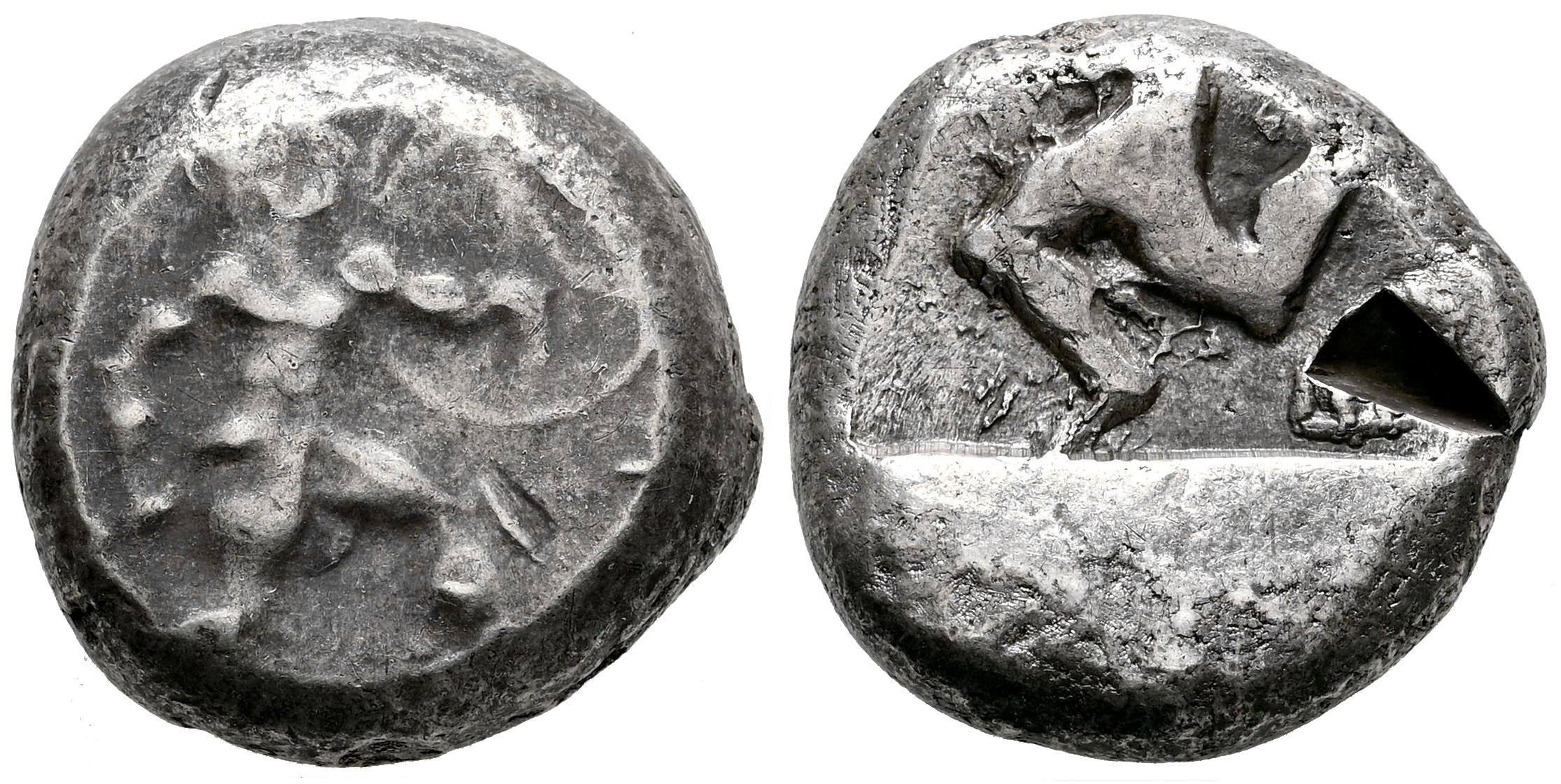 Pamphylia. Aspendos. Estátera. 460-420 a.C. (Sng France-1). (SNG von Aulock-4483). Anv.: Hoplita desnudo y con casco avanzando hacia la derecha, sosteniendo una lanza en la mano derecha y un escudo redondo en la izquierda. Rev.: Triskeles a la izquierda; E a la izquierda, todo dentro de un cuadrado incuso poco profundo. Ag. 10,79 g. Corte de prueba. MBC-. Est...150,00.
