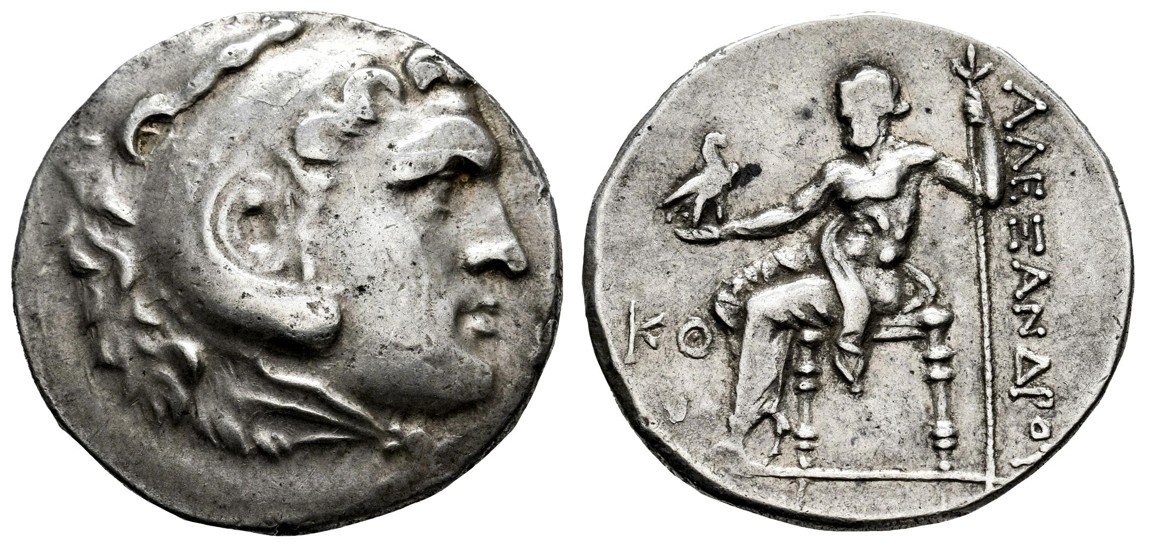 Pamphylia. Perge. Tetradracma. CY 29 = 193/2 a.C. En nombre y tipos de Alejandro III de Macedonia. (Price-2943). (DCA-314). Anv.: Cabeza de Heracles a la derecha, con tocado de piel de león. Rev.: Zeus Aëtophoros sedente a la izquierda, sosteniendo un cetro; AΛEΞANΔPOY en el campo derecho, KΘ (fecha) en el campo izquierdo. Ag. 16,89 g. MBC+. Est...300,00.