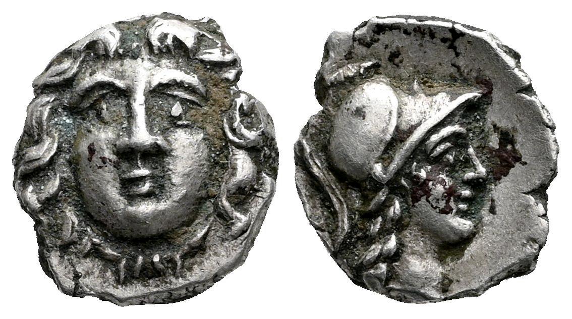 Pisidia. Selge. Óbolo. 350-300 a.C. (Sng von Aulock-5280). Anv.: Gorgoneion de frente. Rev.: Cabeza de Atenea a la derecha, con casco ático con cresta; detrás, (astrágalo y monograma). Ag. 0,93 g. Buena acuñación para este tipo. Depósitos. EBC-. Est...80,00.