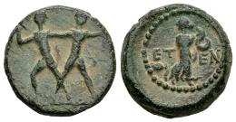 Pisidia. Etenna. AE 14. Siglo I a.C. (SNG BnF-1532/3). (SNG von Aulock-Pisidiens 738). (Sng Cop-149/50). Anv.: Dos hombres en pie uno frente al otro, luchando con un hacha doble y un cuchillo curvo. Rev.: Ninfa avanzando hacia la derecha, sosteniendo una serpiente; oinochoe a la izquierda; ET-EN a través de los campos. Ae. 3,19 g. Buen ejemplar para este tipo. MBC+. Est...100,00.