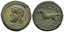 Pisidia. Termessos. AE 20. Año CY 32 = 40/39 a.C. (Sng Cop-302 corr.). (Sng France-2145/6 corr.). Anv.: Cabeza laureada de Zeus a la izquierda; Λ-B (fecha) en el otro lado. Rev.: TEPM-H-CEΩΝ, caballo a la izquierda. Ae. 5,08 g. Buen ejemplar, de los mejores ejemplares que hemos visto. Est...150,00.