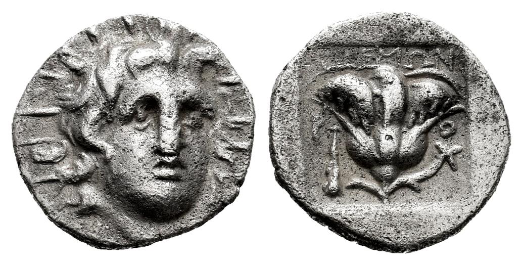 Rhodos. Rhodes. Hemidracma. 170-150 a.C. Magistrado Artemón. (Jenkins-1989, 44). (Bmc-294). (Sng Cop-842). Anv.: Cabeza radiada de Helios orientada ligeramente hacia la derecha. Rev.: Rosa con capullo a la derecha, P-O flanqueando; ΑΡΤΕΜΩN, arriba, maza en el campo izquierdo. Ag. 1,16 g. MBC. Est...90,00.