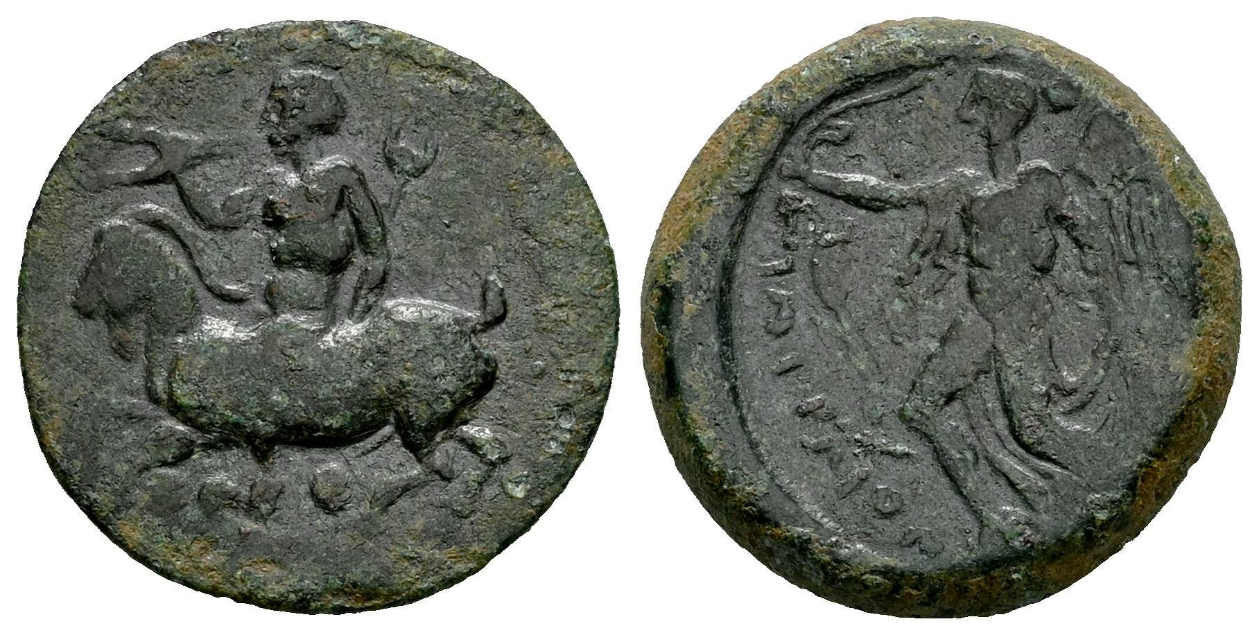 Sicilia. Himera. Tetras o Trionkion. 420-415 a.C. (CNS-I 31). (Hgc-2, 475). Anv.: Pan, soplando en una caracola y sosteniendo lagobolon en el brazo, montando una cabra que salta hacia la izquierda; espiga y tres puntos (marca de valor) debajo. Rev.: Niké avanzando hacia la izquierda, sosteniendo un aphlaston y el dobladillo de chiton. Ae. 2,26 g. Ex Numismatik Naumann 5 (07/07/2013), lote 23. MBC. Est...100,00.
