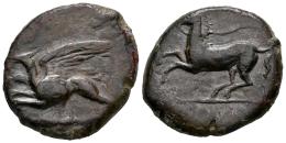 Sicilia. Kainon. AE 23. 260-340 a.C. (Campana-1). (CNS-I 1). (Hgc-2, 509). Anv.: Grifo saltando hacia la izquierda. Rev.: Caballo brincando hacia la izquierda, riendas sueltas; (KAINON) en exergo. Ae. 8,39 g. MBC. Est...60,00.