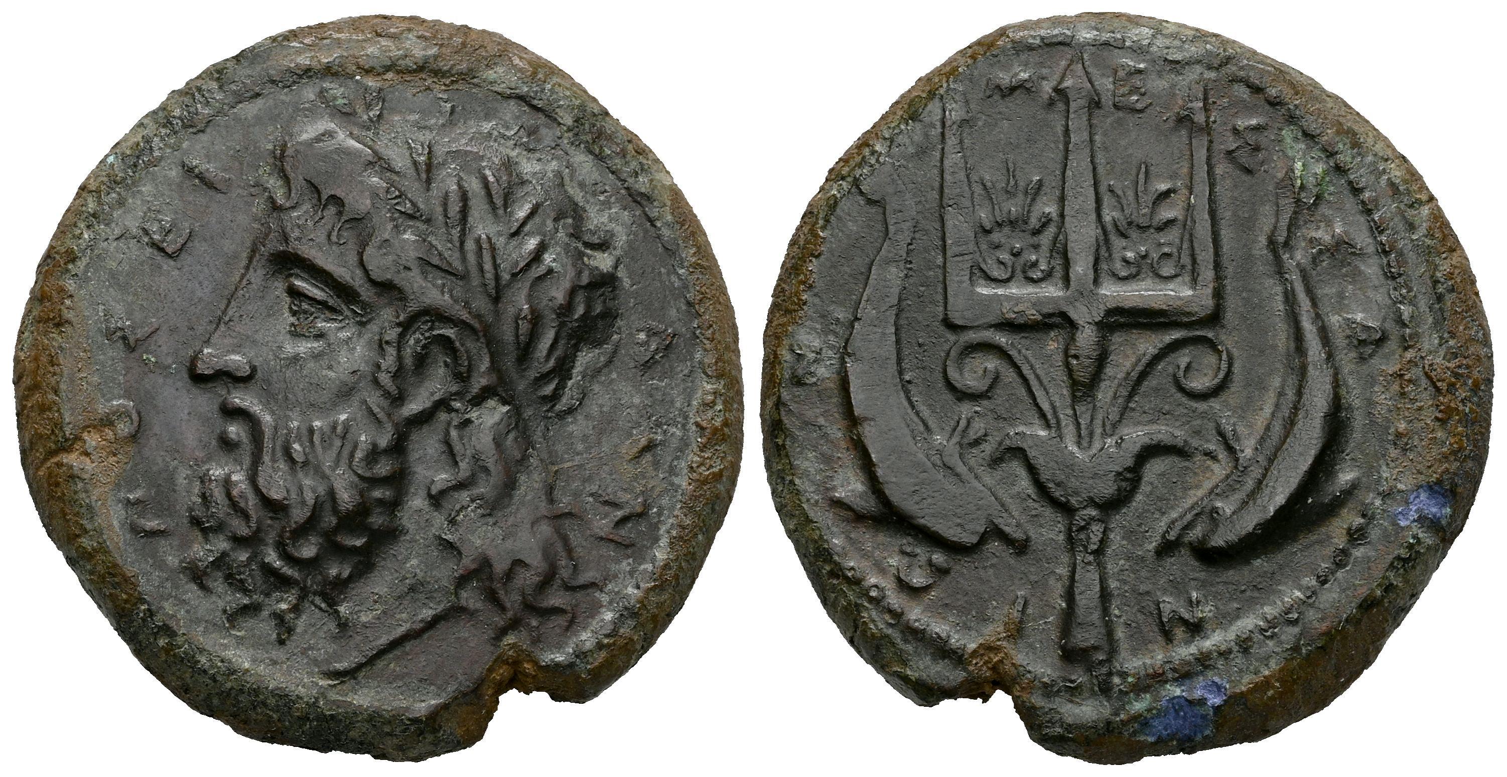 Sicilia. Messana. Litra. 338-318 a.C. (Sng Ans-393). (CNS-12). (Hgc-2, 830). Anv.: Cabeza en corona de Poseidón a la izquierda, ΠOΣEIΔAN delante. Rev.: Tridente decorado; delfines a izquierda y derecha; MEΣΣANIΩN alrededor. Ae. 15,80 g. Buen ejemplar. Pátina algo saltada en el canto. Ex Heritage 3035 (03/09/2014), lote 29014. MBC+. Est...300,00.