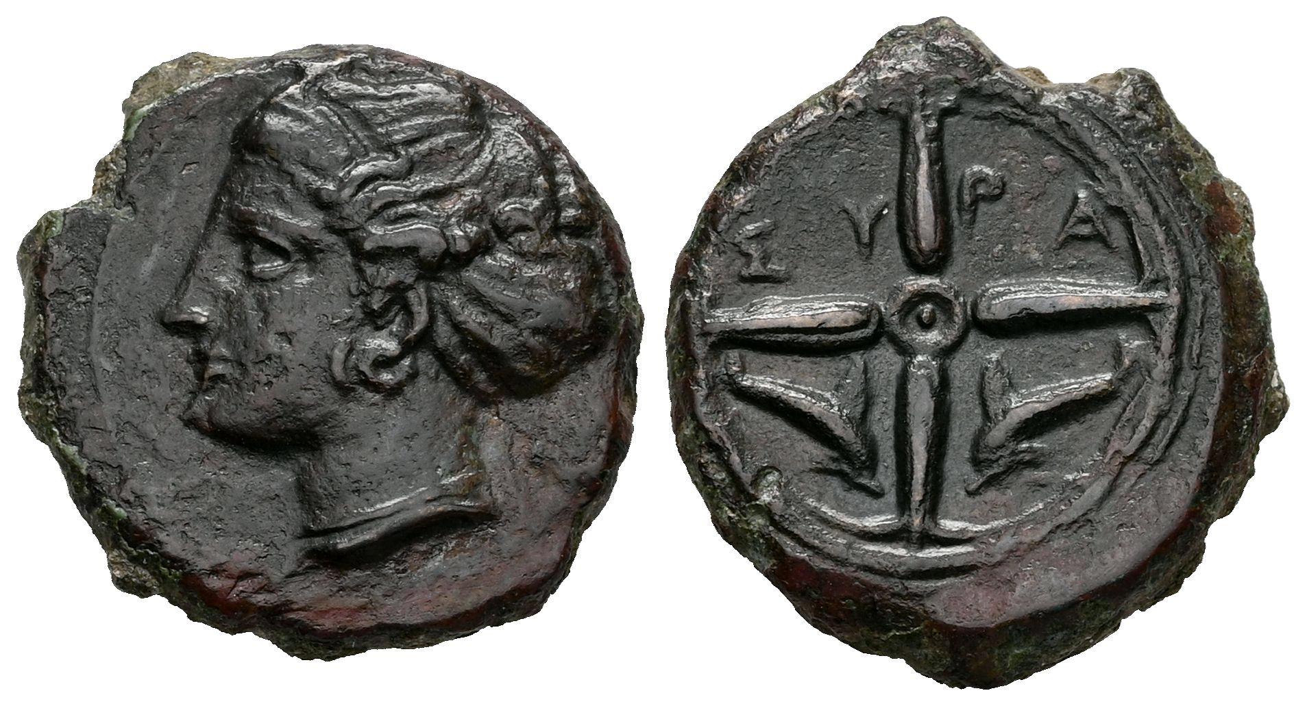 Sicilia. Siracusa. Hemilitron. 405 a.C. Segunda Democracia. (CNS-22). (Hgc-2, 1479). (SNG Ans-404/10). Anv.: Cabeza de Aretusa a la izquierda, con el cabello recogido en Sphendone. Rev.: Rueda de cuatro radios; delfines en los cuartos inferiores, ΣY-PA arriba. Ae. 3,70 g. MBC+/EBC-. Est...120,00.
