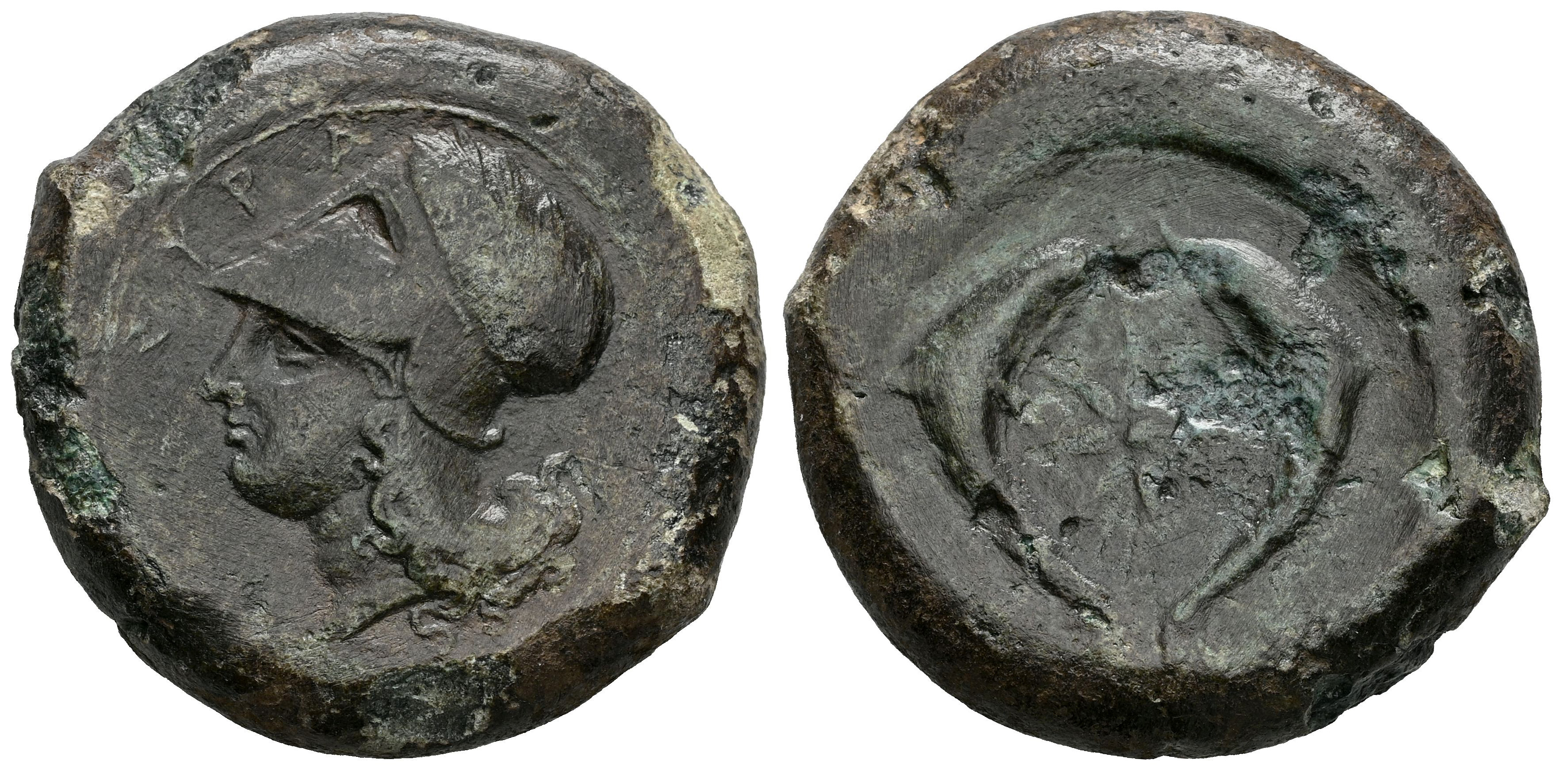 Sicilia. Siracusa. AE 33. 405-367 a.C. Tiempos de Dionysios I. (CNS-II 62). (Sng Ans-454/69). (Hgc-2, 1436). Anv.: Cabeza de Atenea a la izquierda, con casco corintio decorado con corona; ΣYPA delante. Rev.: Estrella de mar entre dos delfines. Ae. 23,74 g. Pátina algo saltada en el canto. MBC+/MBC-. Est...120,00.