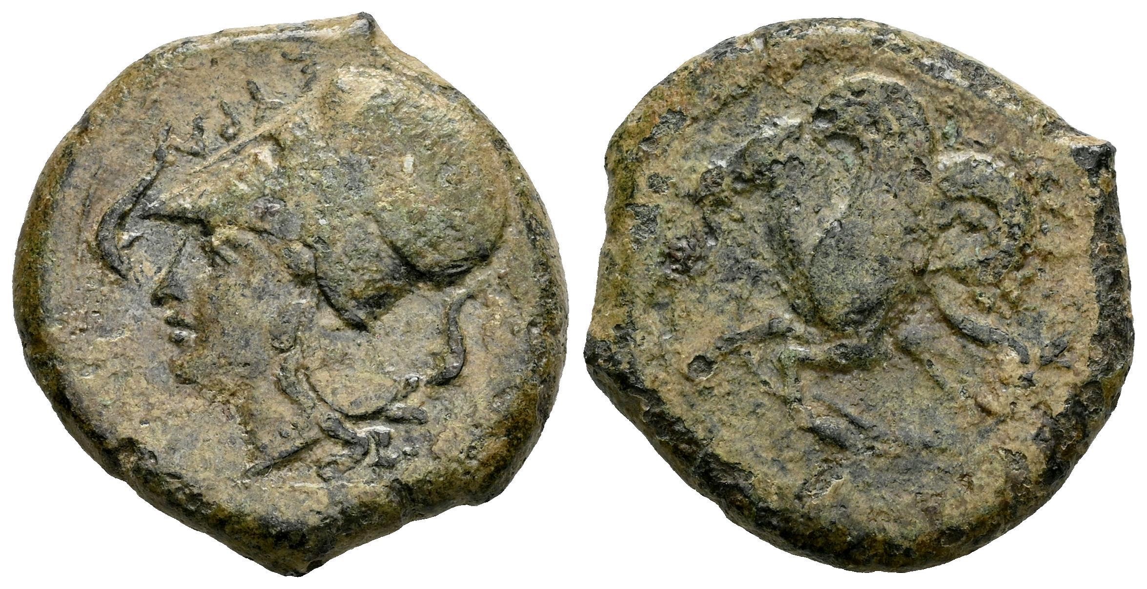 Sicilia. Siracusa. Litra. 375-344 a.C. Tiempos de Dionysios I. (CNS-II 44). (Sng Ans-447). (Sng Cop-722). Anv.: Cabeza con casco de Atenea a la izquierda; ΣYPA arriba, delfín delante y detrás. Rev.: Hipocampo a la izquierda, rienda larga colgando debajo. Ae. 6,48 g. Escasa. MBC-/BC+. Est...90,00.