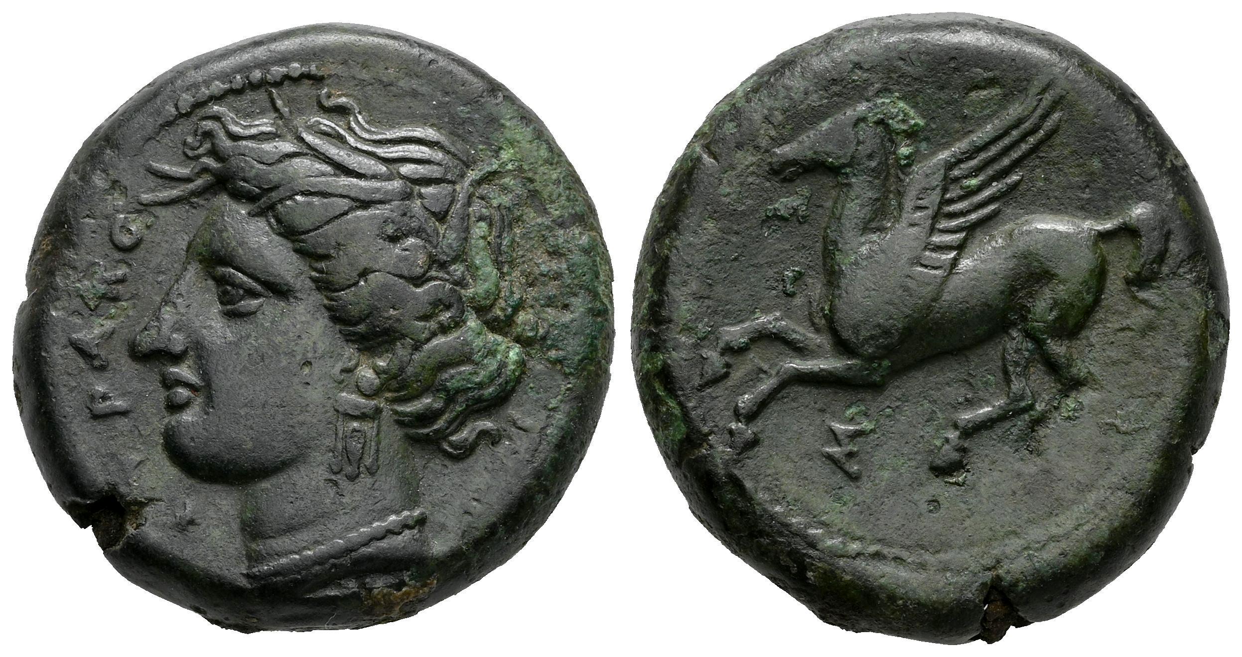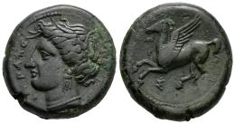 Sicilia. Siracusa. AE 22. 334-317 a.C. Tiempos de Timoleón y la Tercera Democracia. (CNS-78). (Sng Ans-526/9). (Hgc-2, 1442). Anv.: Cabeza coronada de Arethusa a la izquierda; ΣΥΡΑΚΟΣΙΩΝ alrededor. Rev.: Pegasos volando hacia la izquierda; Σ debajo. Ae. 10,66 g. Bonito ejemplar. Ex Artemide Aste 3E (07/07/2010), Lote 3115. Conserva la etiqueta original. MBC+. Est...180,00.