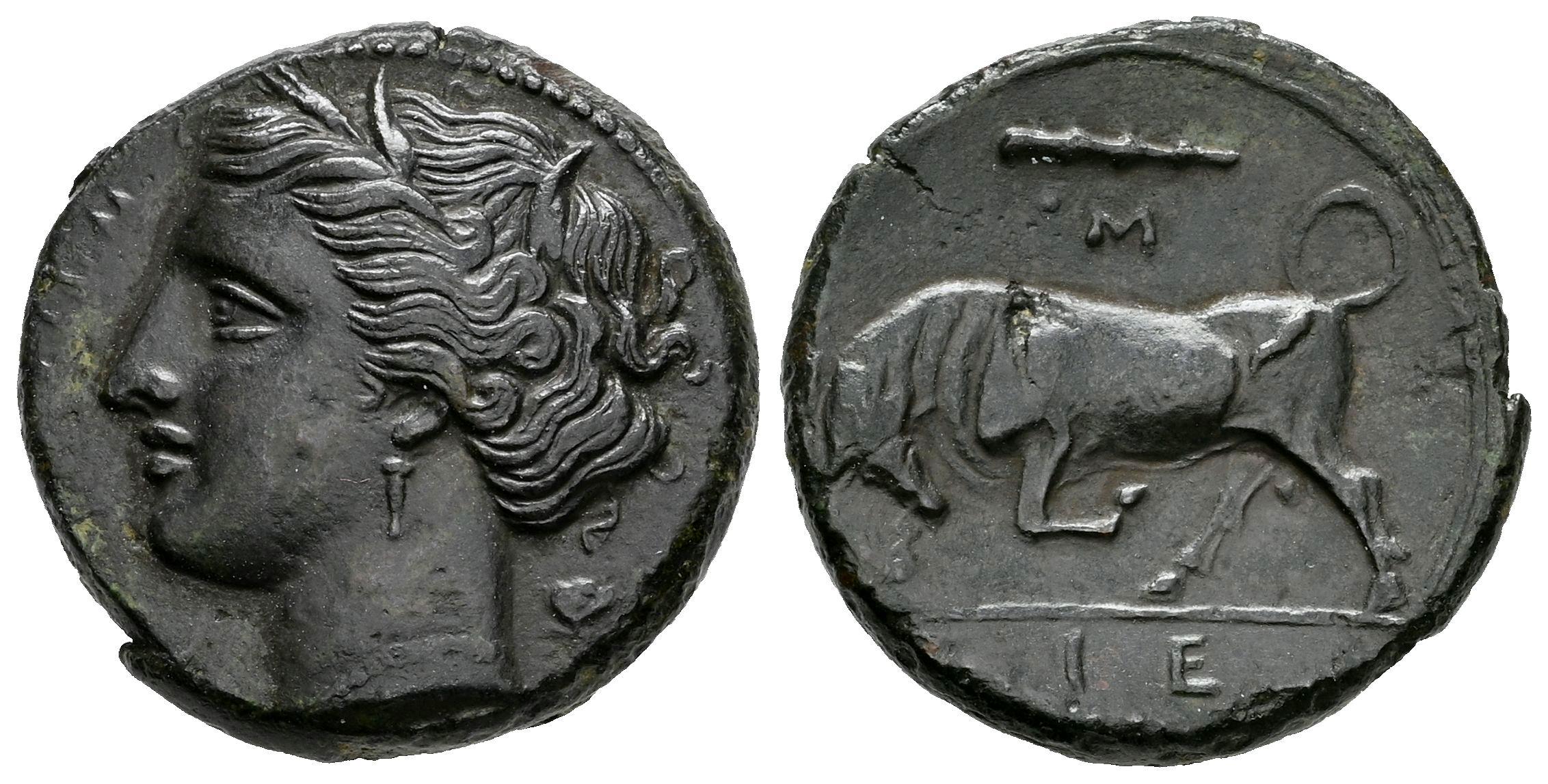 Sicilia. Siracusa. AE 19. 317-289 a.C. Tiempos de Agathokles. (Sng Ans-580). (Calciati-II 345, 191Ds 65RI 12). Anv.: Cabeza de Aretusa a la izquierda; ΣΥΡΑΚΟΣΙΩΝ delante, racimo de uvas detrás. Rev.: Toro embistiendo a la izquierda; Maza arriba con M abajo, I E en exergo . Ae. 5,79 g. Atractivo ejemplar. Rara así. Ex Hess Divo 310 (22/10/2008), lote 34. EBC. Est...200,00.