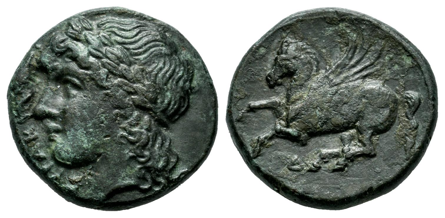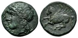 Sicilia. Siracusa. AE 18. 310-305 a.C. Tiempos de Agathokles. (CNS-II 85 (Tercera Democracia)). (Hgc-2, 1486). Anv.: Cabeza laureada de Apolo a la izquierda; ΣYPAKO(ΣIΩN) delante. Rev.: Pegaso volando a la izquierda; Δ debajo. Ae. 5,14 g. Pátina verde. MBC+/MBC. Est...60,00.