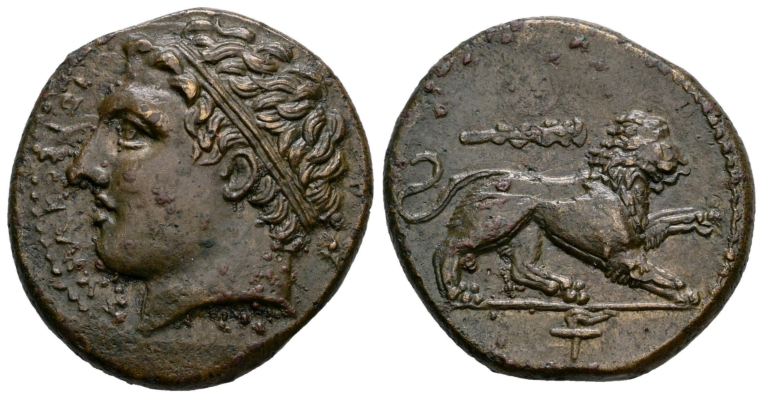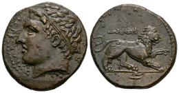 Sicilia. Siracusa. Litra. 295-289 a.C. Tiempos de Agathokles. (Bmc-402). Anv.: Cabeza del joven Heracles a la izquierda, con tainia; ΣVRΑΚΟΣΙΟΝ delante, estrella detrás. Rev.: León avanzando a la derecha, levantando la pata delantera izquierda; maza arriba, antorcha corriendo en exergo. Ae. 7,49 g. Bonita pátina marrón ligeramente erosionada. Atractiva. EBC/EBC-. Est...200,00.