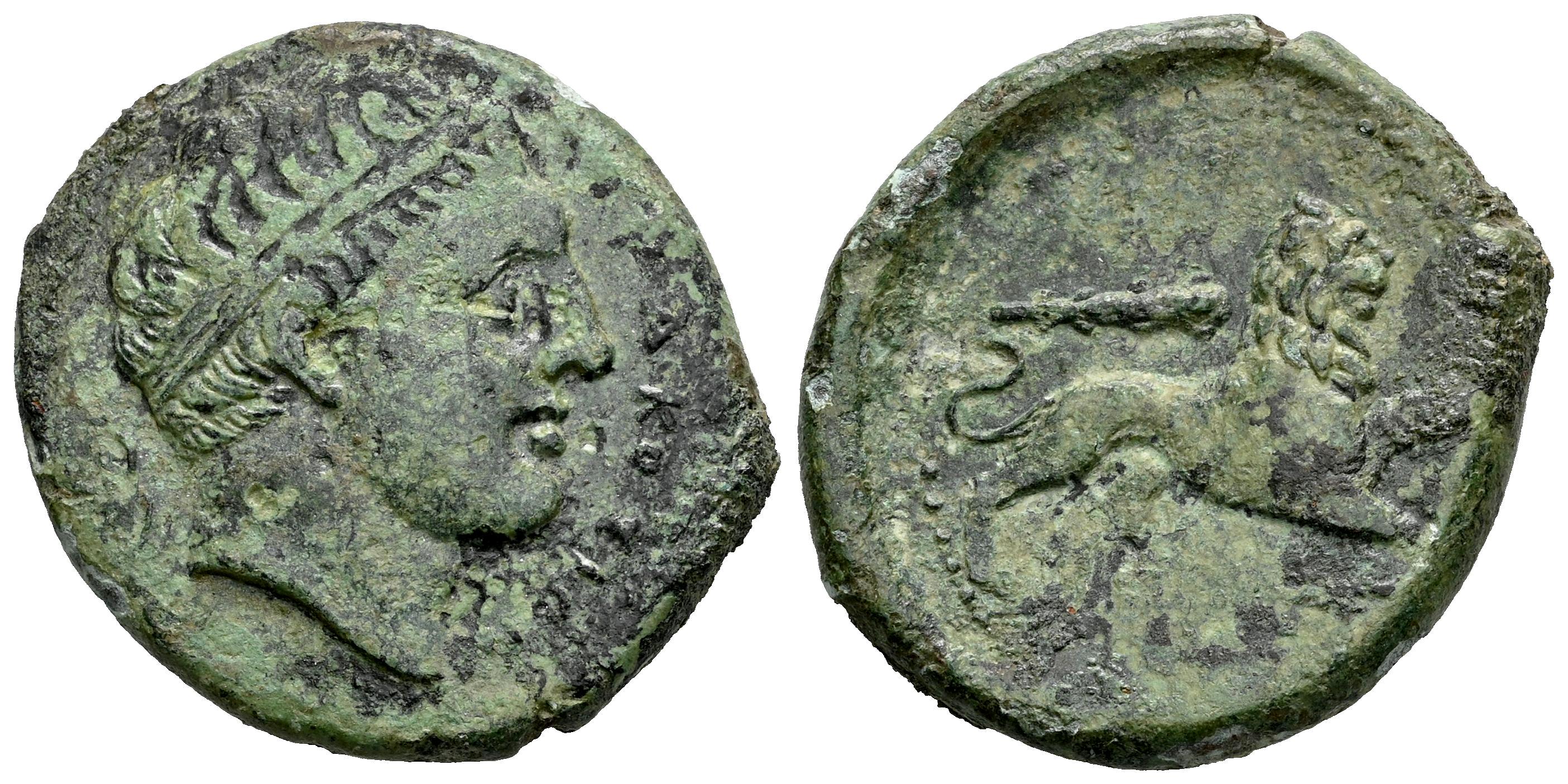 Sicilia. Siracusa. Litra. 295-289 a.C. Tiempos de Agathokles. (CNS-II 151). (Sng Ans-740). (Hgc-2, 1465). Anv.: Cabeza del joven Heracles a la derecha, con tainia; ΣVRΑΚΟΣΙΟΝ delante, arco detrás. Rev.: León avanzando a la derecha; maza arriba, flecha en exergo. Ae. 8,26 g. Pátina verde. Rara. MBC-. Est...70,00.