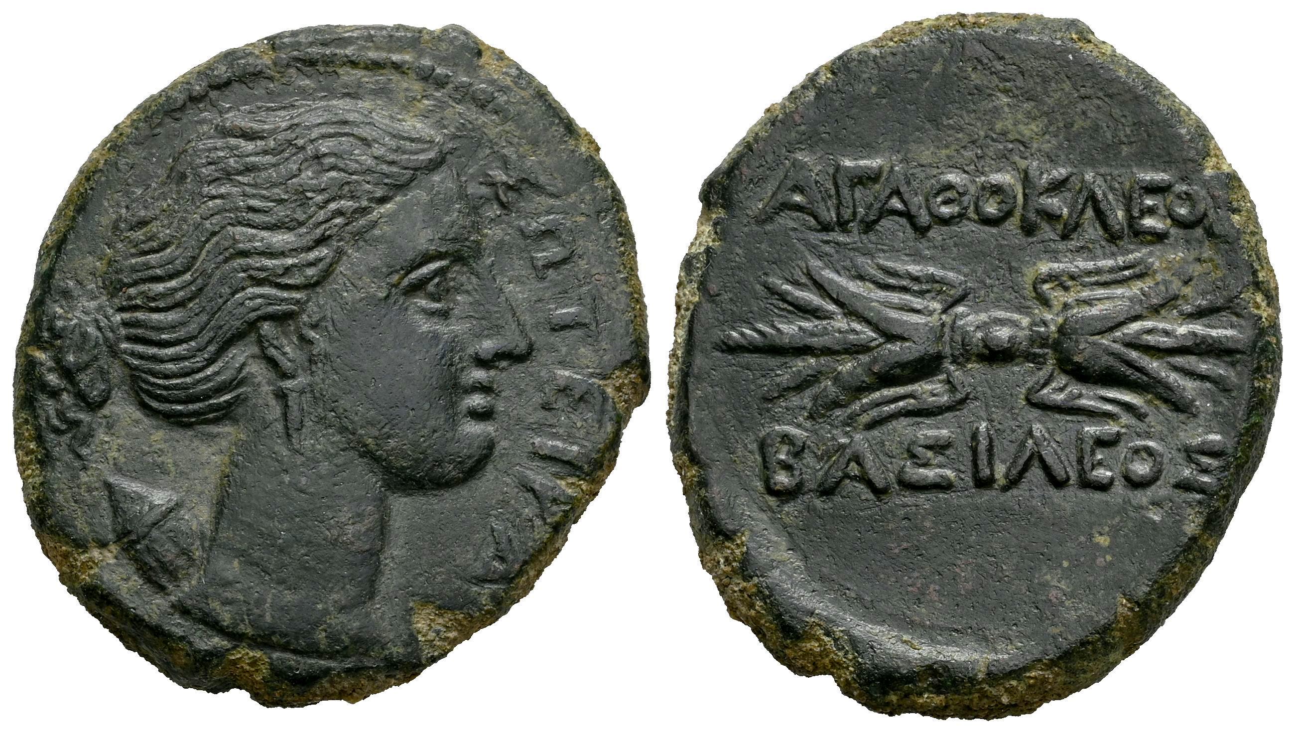 Sicilia. Siracusa. AE 25. 295-289 d.C. Tiempos de Agathokles. (CNS-II 142). (Sng Ans-708). (Hgc-2, 1537). Anv.: Busto drapeado de Artemisa Soteira a la derecha; carcaj sobre el hombro, ΣΩTEIPA hacia abajo delante. Rev.: Rayo alado; AΓAΘOKΛEOΣ arriba, BAΣIΛEOΣ abajo. Ae. 9,58 g. MBC+/EBC-. Est...120,00.