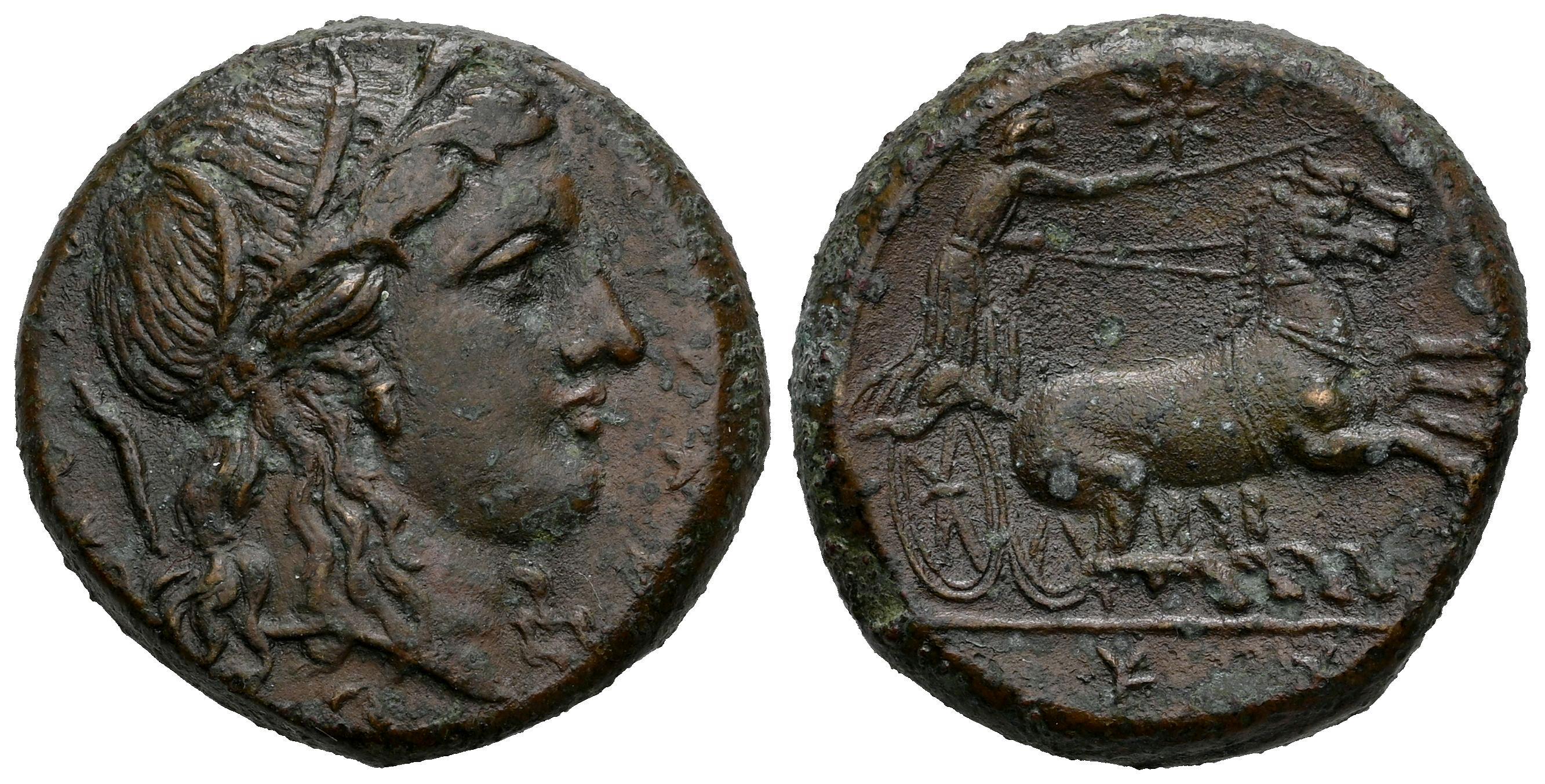 Sicilia. Siracusa. AE 23. 287-278 a.C. Tiempos de Hiketas. (Hgc-2, 1447). (CNS-122 Ds 50 R1 5). Anv.: Cabeza de Kore con corona a la derecha; antorcha a la izquierda, ΣYPAKOΣIΩN delante. Rev.: Auriga conduciendo biga a la derecha; estrella arriba, monograma EY y X en el exergo. Ae. 11,08 g. MBC+/EBC-. Est...120,00.