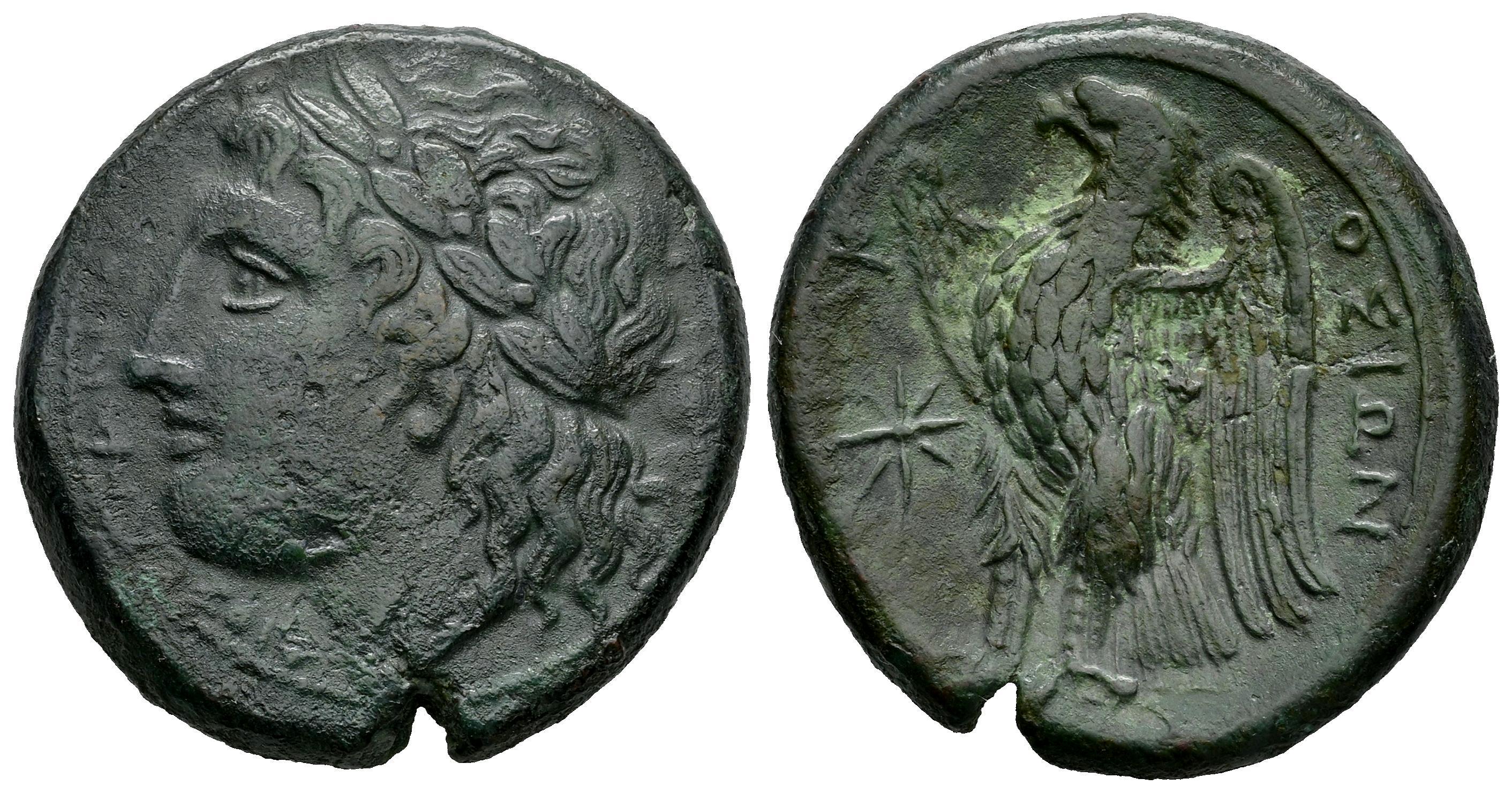 Sicilia. Siracusa. AE 25. 287-278 a.C. Tiempos de Hiketas II. (Hgc-2, 1448). Anv.: Cabeza laureada de Zeus Hellanios a la izquierda; ΔΙΟΣ ΕΛΛΑΝΙΟΥ delante, trofeo detrás. Rev.: Águila con las alas extendidas parada a la izquierda sobre un rayo; ΣΥΡΑΚ-ΟΣΙΩΝ alrededor, una estrella arriba a la izquierda. Ae. 11,56 g. MBC+/EBC-. Est...120,00.