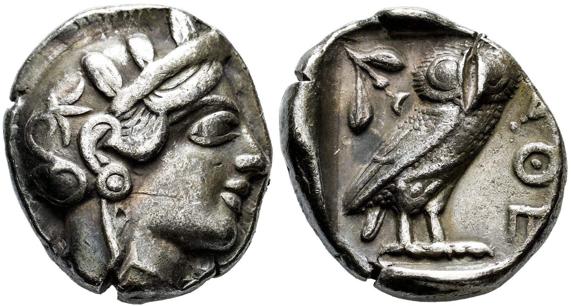 Attica. Atenas. Tetradracma. 454-404 a.C. (Kroll-8). (Sng Cop-31). (Hgc-4, 1597). Anv.: Cabeza de Atenea a la derecha, con casco ático con cresta adornado con tres hojas de olivo sobre la visera y palmeta en espiral en el cuenco, arete redondo con punto central y collar de perlas. Rev.: Búho en pie a la derecha de frente, ramita de olivo y creciente detrás, ΑΘΕ delante; todo dentro de cuadrado incuso. Ag. 16,88 g. Suave pátina. Ligero tono. Corte de prueba en reverso. MBC. Est...300,00.