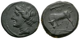 Sicilia. Siracusa. AE 18. 275-265 a.C. Tiempos de Hieron II. (CNS-II 199 Ds 41 R1 8). (Hgc-2, 1497). Anv.: Cabeza de Kore enguirnaldada a la izquierda. Rev.: Toro embistiendo a la izquierda; maza y N arriba, IE en exergo. Ae. 5,46 g. MBC+. Est...90,00.