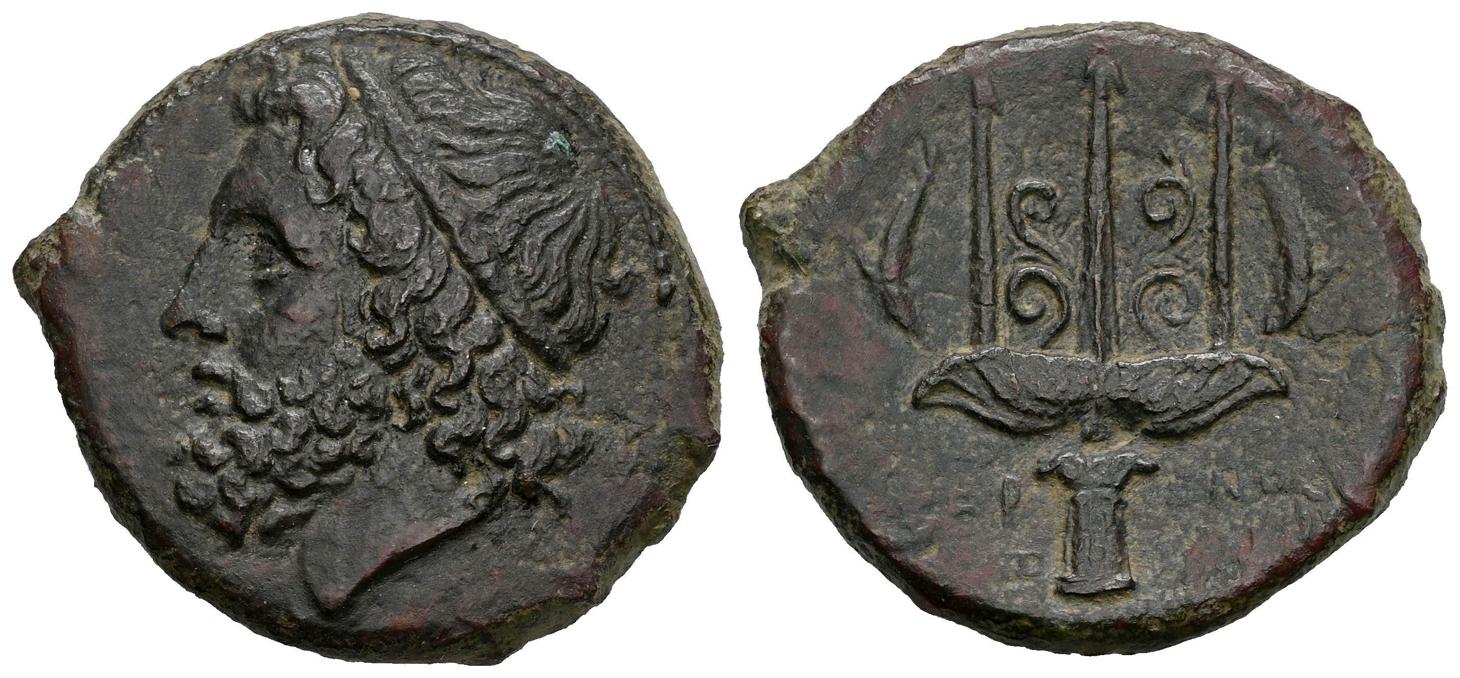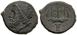 Sicilia. Siracusa. AE 24. 240-215 a.C. (Bmc-600). Anv.: Cabeza de Poseidón con diadema a la izquierda. Rev.: Tridente flanqueado por dos delfines nadando hacia abajo; IEPΩNOΣ a través de los campos, monograma a la izquierda. Ae. 8,48 g. Ex Gerhard Hirsch 264 (25/11/2009), lote 111. MBC+. Est...100,00.