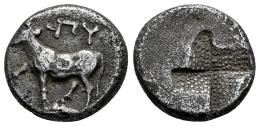 Tracia. Byzantion. Hemidracma. 340-320 a.C. (SNG BM Black Sea-36). (Hgc-3.2, 1390). Anv.: Toro caminando hacia la izquierda sobre un delfín; ΠΥ arriba. Rev.: Cuadrado cuadripartito incuso punteado. Ag. 2,29 g. MBC. Est...50,00.