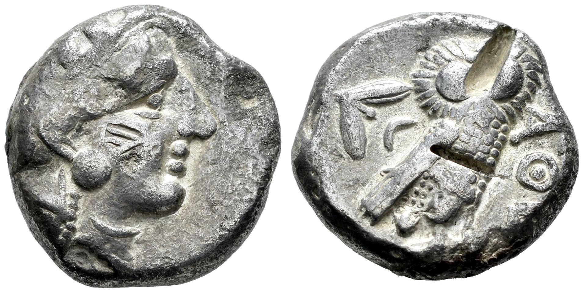 Attica. Atenas. Tetradracma forrado. 454-404 a.C. (Sng Cop-31). (Hgc-4,1597). Anv.: Cabeza de Atenea a la derecha. Rev.: Lechuza en pie a la derecha con la cabeza de frente, detrás rama de olivo y creciente, ΑΘΕ delante. Ag. 17,19 g. Marca de banquero en anverso y cortes de prueba. MBC-. Est...200,00.