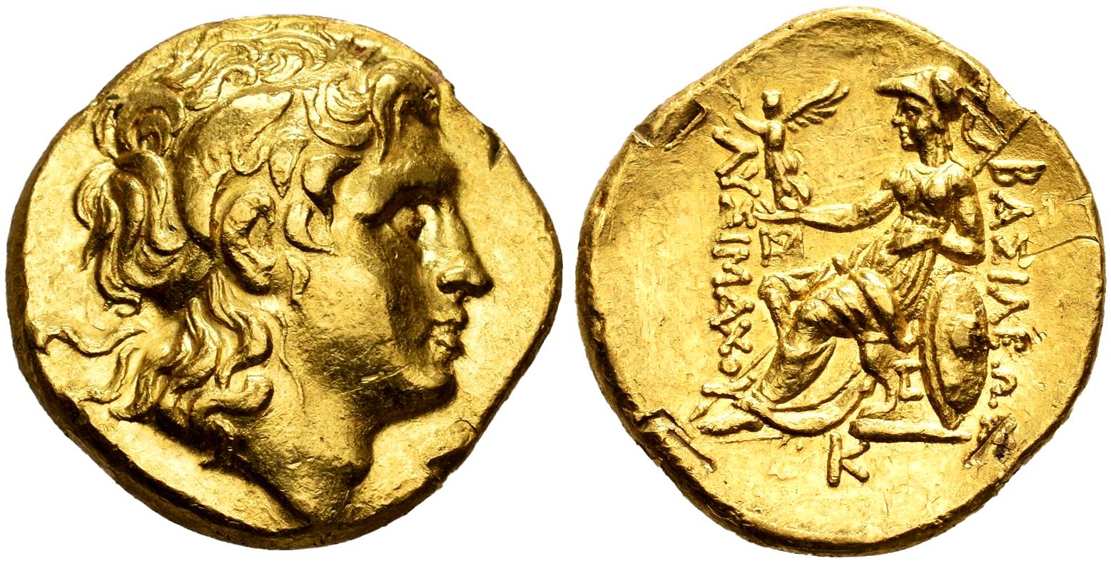 Reyes de Tracia. Lysimachos. Estátera. 270-260 a.C. Byzantion. (Thompson-241 (Pella)). Anv.: Cabeza de Alejandro Magno, con diadema, a la derecha, con el cuerno de Amón sobre la oreja. Rev.: ΒΑΣΙΛΕΩΣ ΛΥΣΙΜΑΧΟΥ. Atenea sedente a la izquierda, sosteniendo a Niké, coronando el nombre del rey, en su mano derecha y apoyada con el brazo izquierdo sobre un escudo decorado con una cabeza de león; detrás, una lanza transversal; en el campo interior izquierdo, un monograma; en el trono, un símbolo en forma de C; en el exergo, la K. Au. 8,59 g. Marcas de agarre, aún así buena presencia . EBC-/EBC. Est...3000,00.