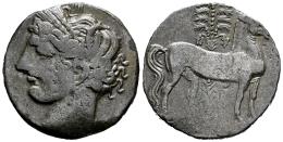 Zeugitania. Cartago. Doble shekel. 264-241 a.C. Primera guerra Púnica. (Sng Cop-190.1). (Müller-104). Anv.: Cabeza de Tanit con corona a la izquierda, con arete con colgante triple y collar. Rev.: Caballo en pie a la derecha, palmera detrás. Ve. 11,35 g. Suave pátina. Escasa. MBC/MBC+. Est...500,00.