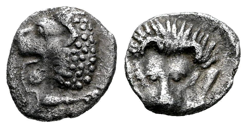 Sátrapas de Caria. Hekatomnos. Hemióbolo. 395-377 a.C. (SNG Keckman-837/40). (SNG von Aulock-1819 (Miletos)). Anv.: Parte delantera de león a la derecha, cabeza invertida a la izquierda. Rev.: Parte delantera del león de frente; (Punta de tridente) debajo. Ag. 0,42 g. Rara. MBC. Est...100,00.